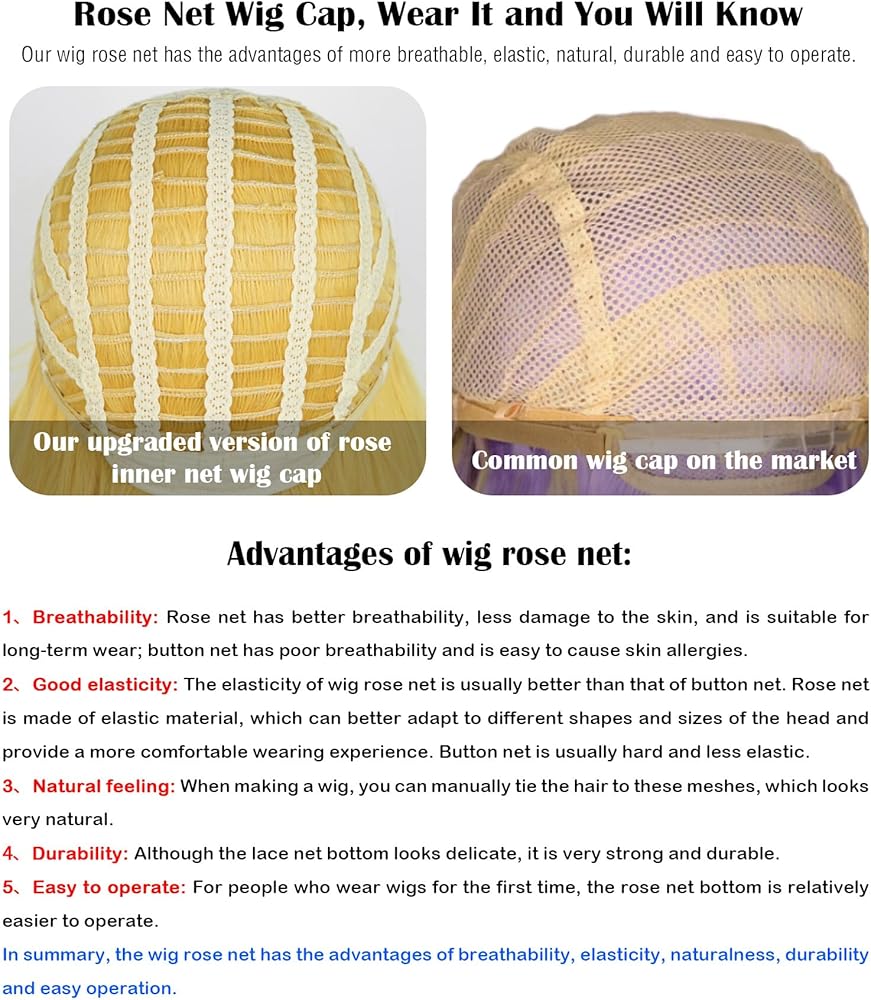 【Adjustable Fit for Maximum Comfort】Designed with an adjustable inner rose net cap, this wig fits head sizes ranging from 19.6" to 23.6". Featuring two adjustable straps, you can secure the wig comfortably and firmly in place. The breathable and elastic rose lace net cap ensures maximum comfort, allowing you to wear it for hours without irritation