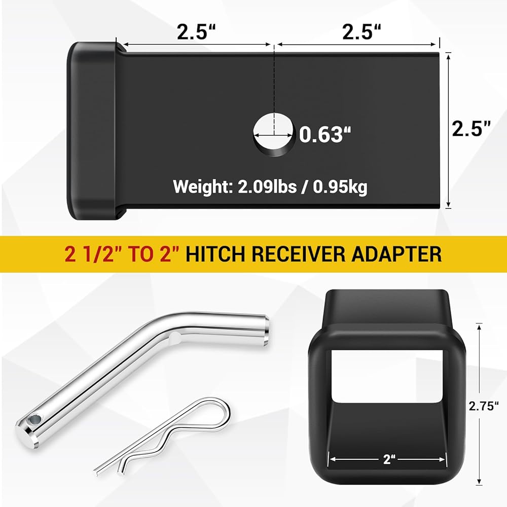 [What You Will Get] The package includes a 2 1/2 to 2 inch hitch receiver adapter along with a hitch pin and clip. TIP: If the hitch pin hole is misaligned, redrilling it can improve its functionality.