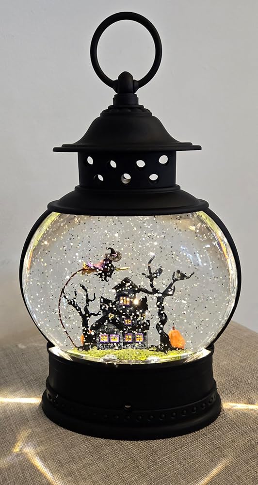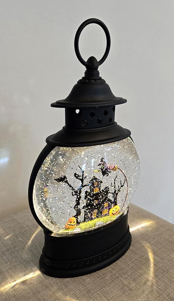 Festive Decor: This lighted water lantern snow globe features a spooky Halloween haunted house scene with a flying witch, pumpkins, and ravens in a scary tree.