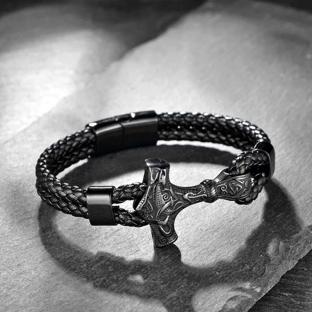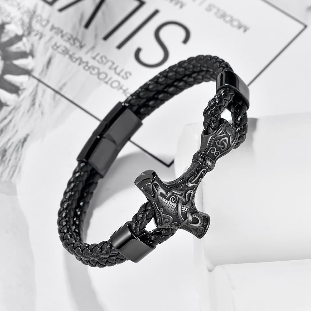 Aprila Men Leather Braided Viking Bracelet,Thor's Braided Wristband Gothic Punk Cuff Stainless Steel Buckle Bracelet for Men,21CM/8.2"