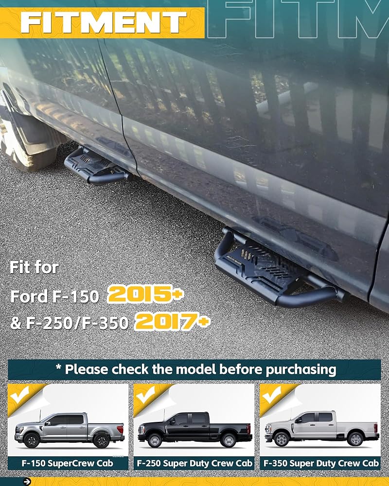 - Custom Fit: The EZ-Steps are designed specifically fit for 2015 2016 2017 2018 2019 2020 2021 2022 2023 2024 2025 Ford F-150 SuperCrew Cab 4-Door 2017 2018 2019 2020 2021 2022 2023 2024 2025 Ford F250 F350 Super Duty Crew Cab.
