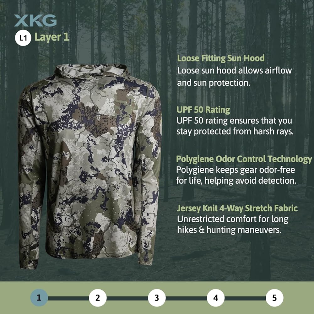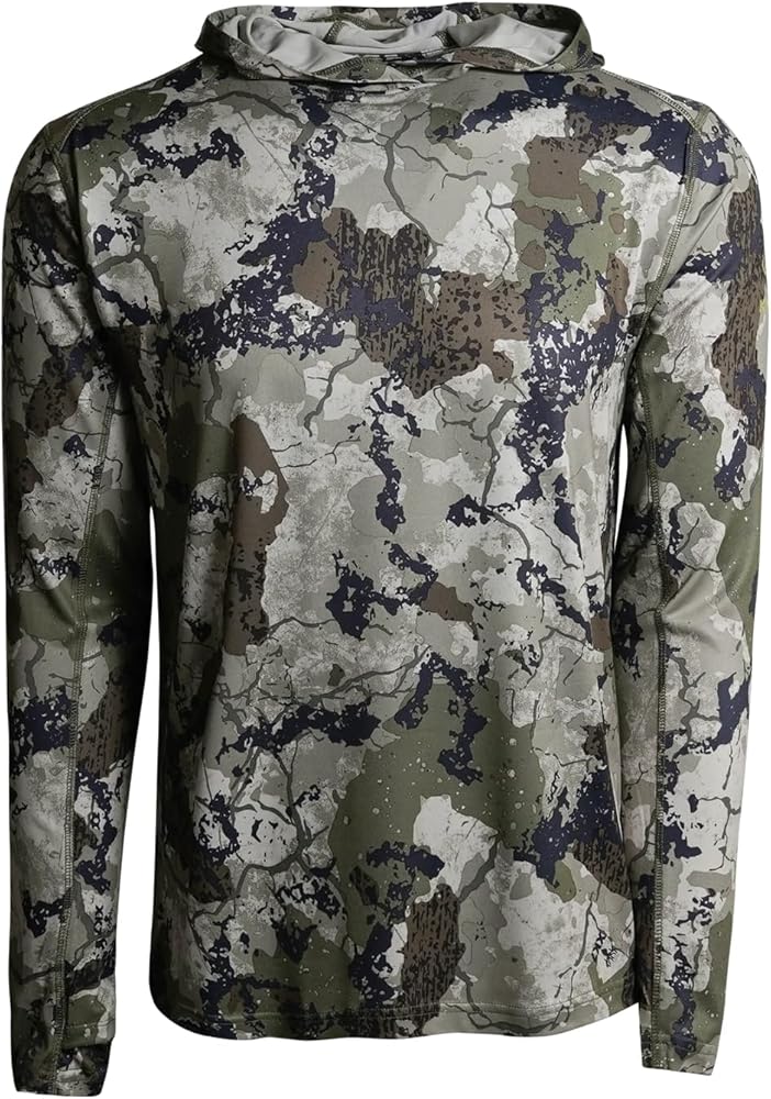 The XKG Performance Hoodie from King's Camo is a long sleeve crossover hoodie designed with comfortable stretch fabric, making it essential for your hunting, fishing, or outdoor gear. It serves as a standalone piece during hot early seasons or as a base layer for mid-late season outings. Featuring Polygiene Odor Control Technology and UPF 50 Protection, it provides optimal comfort and protection under the sun. The four-way stretch fabric ensures excellent mobility and a perfect fit. Whether scaling a mountain, trekking through the woods, or fishing, this hoodie adapts to your movements. Its moisture-wicking properties keep you dry and comfortable, making it ideal for intense physical activities. The loose-fitting sun hood offers an additional layer of protection, while the quick-drying fabric ensures you remain dry even in wet conditions. Weighing only 8.7 oz, it's easy to carry and wear for extended periods without feeling weighed down. Available in both camo and solid color options, the XKG Performance Hoodie blends seamlessly with your outdoor gear. The camo options are perfect for hunters, while the solid colors offer a versatile look suitable for various activities. Durable fabric and quality construction ensure it withstands outdoor adventures, making it a reliable addition to your wardrobe. The XKG Performance Hoodie is a perfect balance of functionality, comfort, and style. Its innovative design and high-quality materials make it essential for outdoor enthusiasts. Whether hunting, fishing, hiking, or camping, this hoodie will keep you protected and comfortable, allowing you to enjoy your adventure.