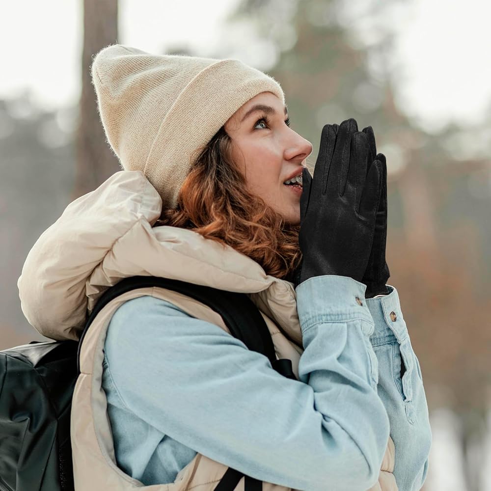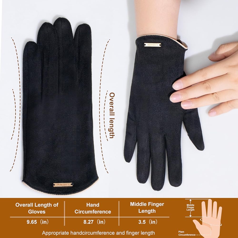 CLASSIC FASHION DESIGN: These suede aesthetic winter gloves are practical and flexible, easy to put on or take off. Their stylish look also makes them suitable for any occasions such as driving, commuting, dog walking, shopping, dressy occasions, winter travelling and so on. These women's warm leather gloves are also a warm winter gift for mum, friends, wife
