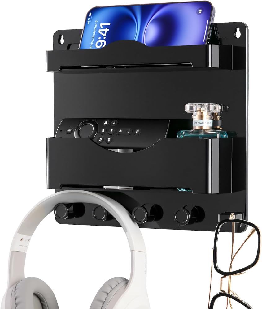 Space-Saving Bedside Organizer with 4 Hooks:Designed to maximize vertical space, this organizer securely holds phones, glasses, remotes, books, keys, headphones, and more. The 5 sturdy hooks at the bottom add extra hanging space for jewelry, hair ties, or cables, keeping your nightstand clutter-free