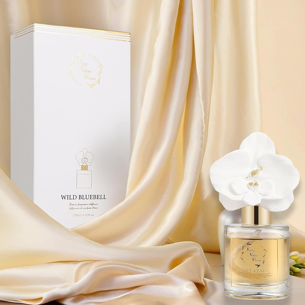 Reed Diffuser Set, Pretty Valley Home Diffuser Gypsum White Orchid Flower Oil 120Ml / 4.05fl OZ Gift Box for Bathroom Office Bathroom Living Room Decor, Long Lasting Fragrance (Wild Bluebell)