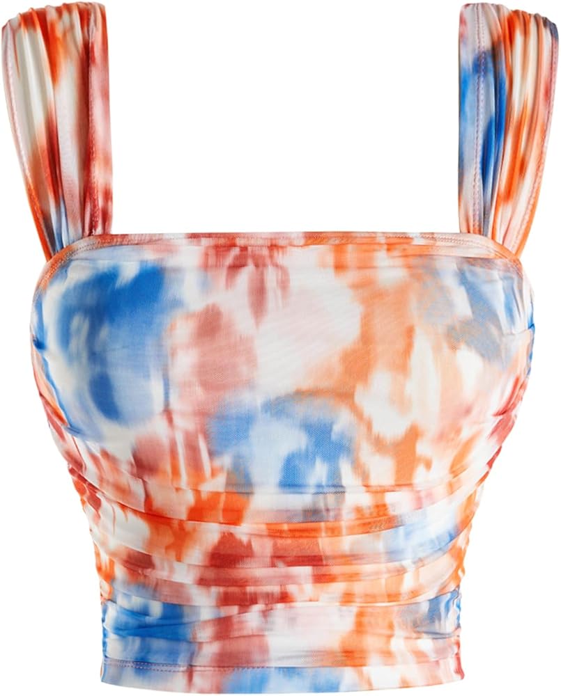 - Features: Floral print, mesh, square neck, sleeveless, wide strap, ruched, slim fit, womens tops, fashionable