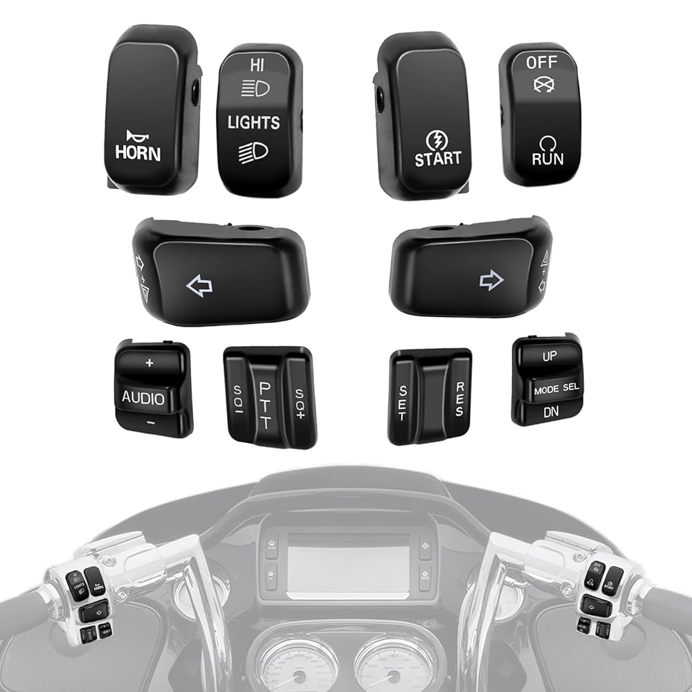 FITMENT - Aftermarket 10 pieces switch caps set compatible for Harley Davidson 1996-2013 FLHT, FLHTC, FLHX and FLTRX and 2010-2011 FLHXXX models; 2002-later VRSC, 1996-2013 XL and XR, 1996-2011 Dyna, 1996-2013 FLHR and 1998-2001 FLHRC models