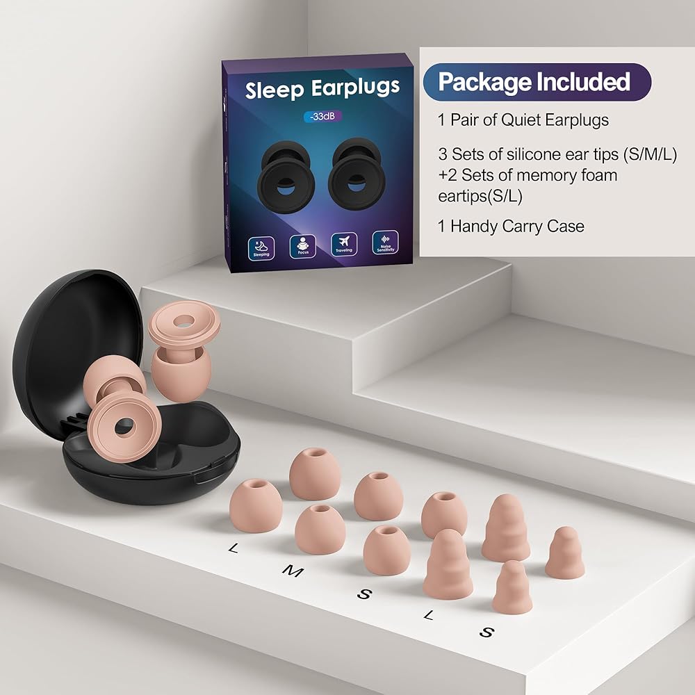 【Package Included】: There are 1 pair of earplugs, 3 sizes of soft silicone ear tips (S-L), 2 sizes of memory ear tips (S-L),1 handy carry case. Our silicone sleeping earplugs are washable, durable and reusable, providing a quiet world in your life. Any question, please feel free to contact us