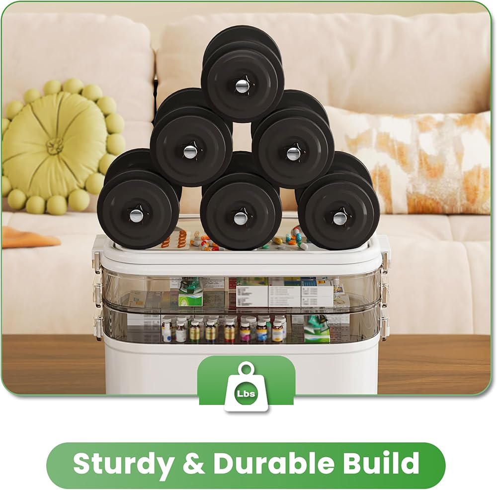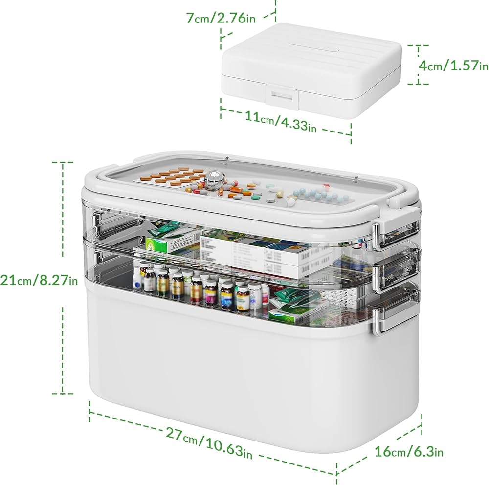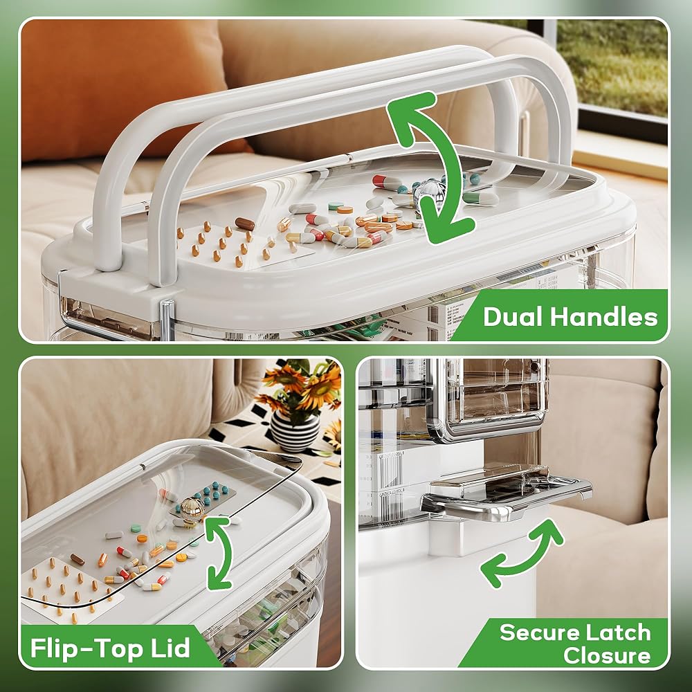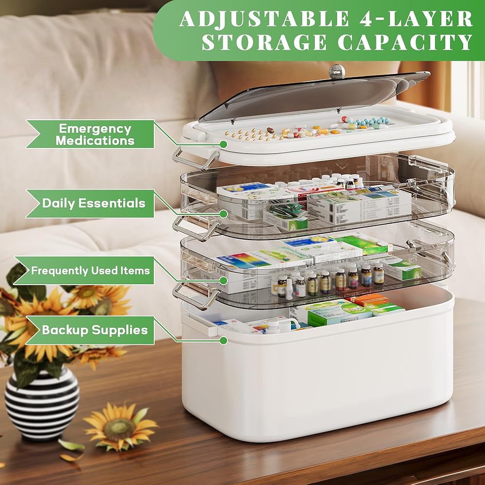 NiHome Home & Travel 4-Tier Medicine Storage Box with Portable Pill Case, Durable Adjustable Compartments, Moisture-Resistant Lid, Secure Handles for Pill Organization, Vitamins, Supplements (White)
