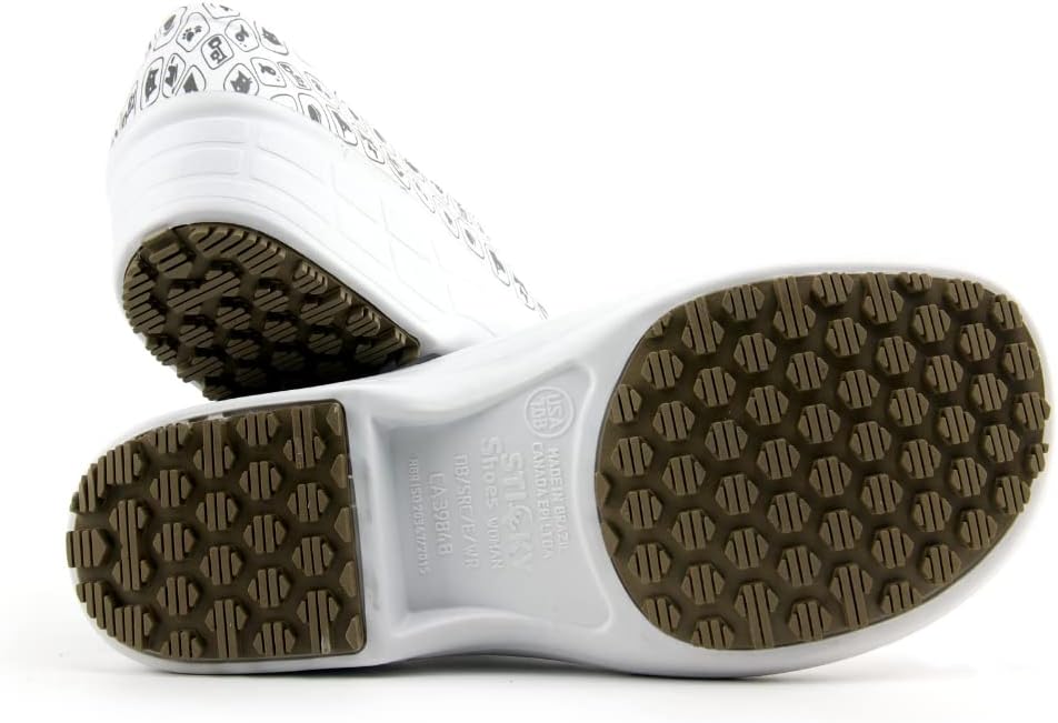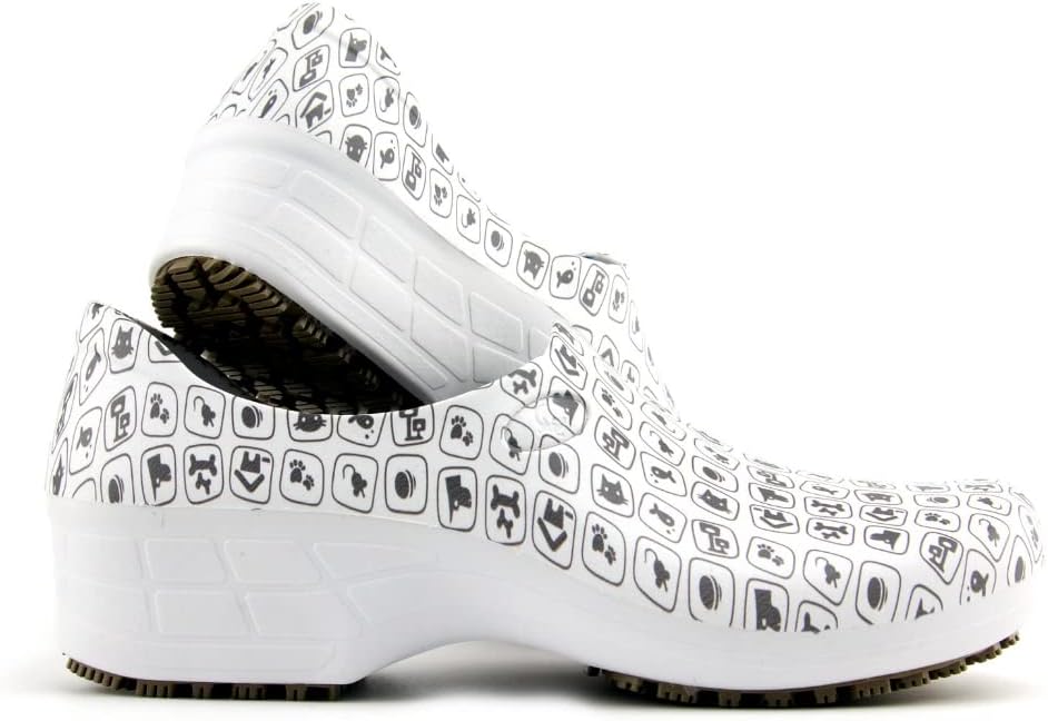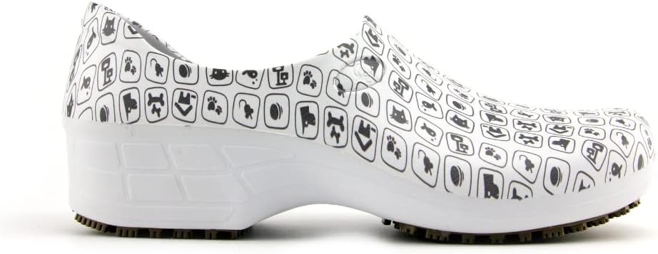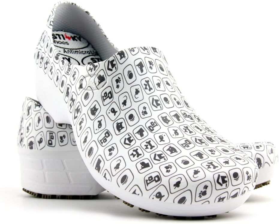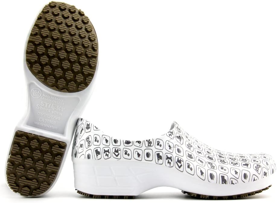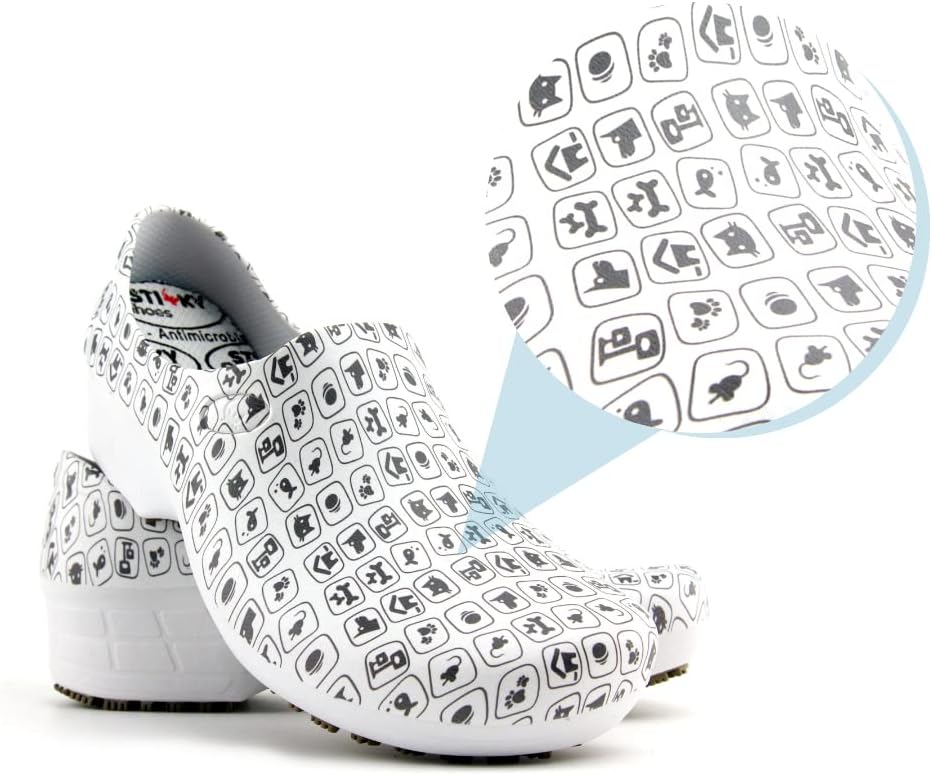 Sticky Printed Colorful Nursing Shoes - Professional Shoes for Women - Nurses Vets CNA LPN RN - Waterproof Non Slip - Comfortable Cleanable Clogs - White