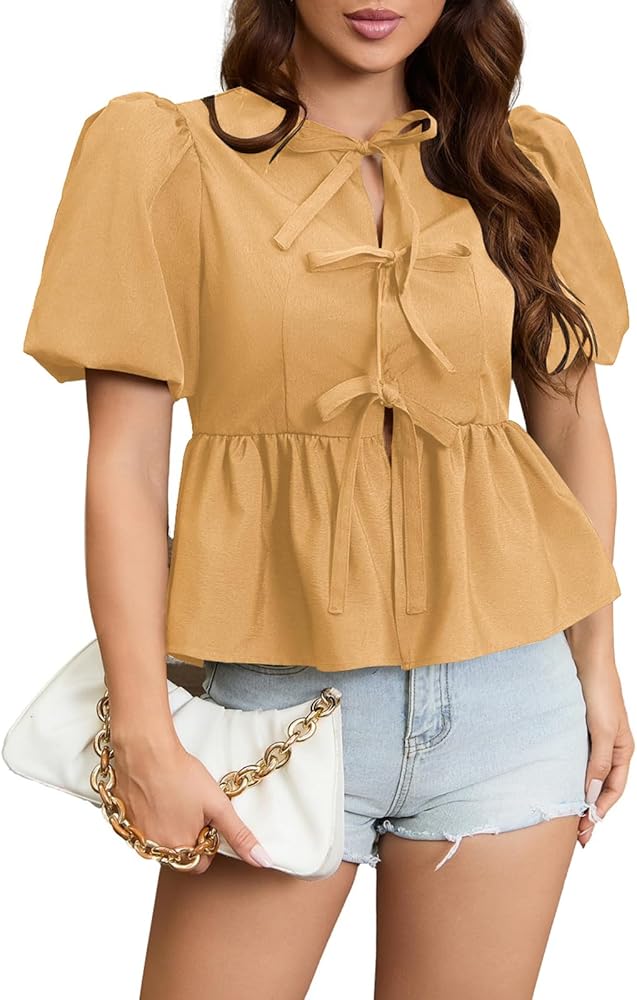 Unique Design:Short puff sleeve, bow tie front design, womens summer peplum blouse is designed for a relaxed fit style ,summer trendy 2025 outfits Y2k peplum shirt for women.