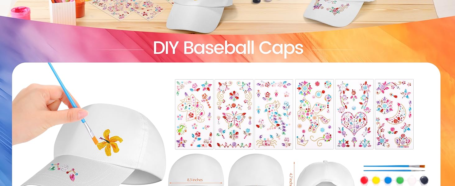 Value pack: you will receive 24 summer DIY baseball caps, 12 acrylic paint kits with 24 tubes of paint and 24 brushes, and 12 sheets of acrylic rhinestone stickers, enough quantity to meet your daily use, replacement needs and DIY needs, the painting baseball caps bulk suits group activities; dive into crafting and enjoy endless fun