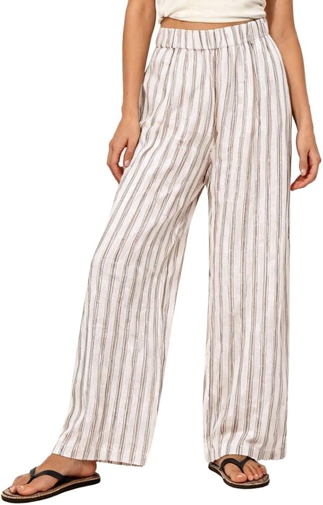 Amazhiyu Women's 100% Linen Summer Casual Elastic Waist Stripes Wide Leg Pants