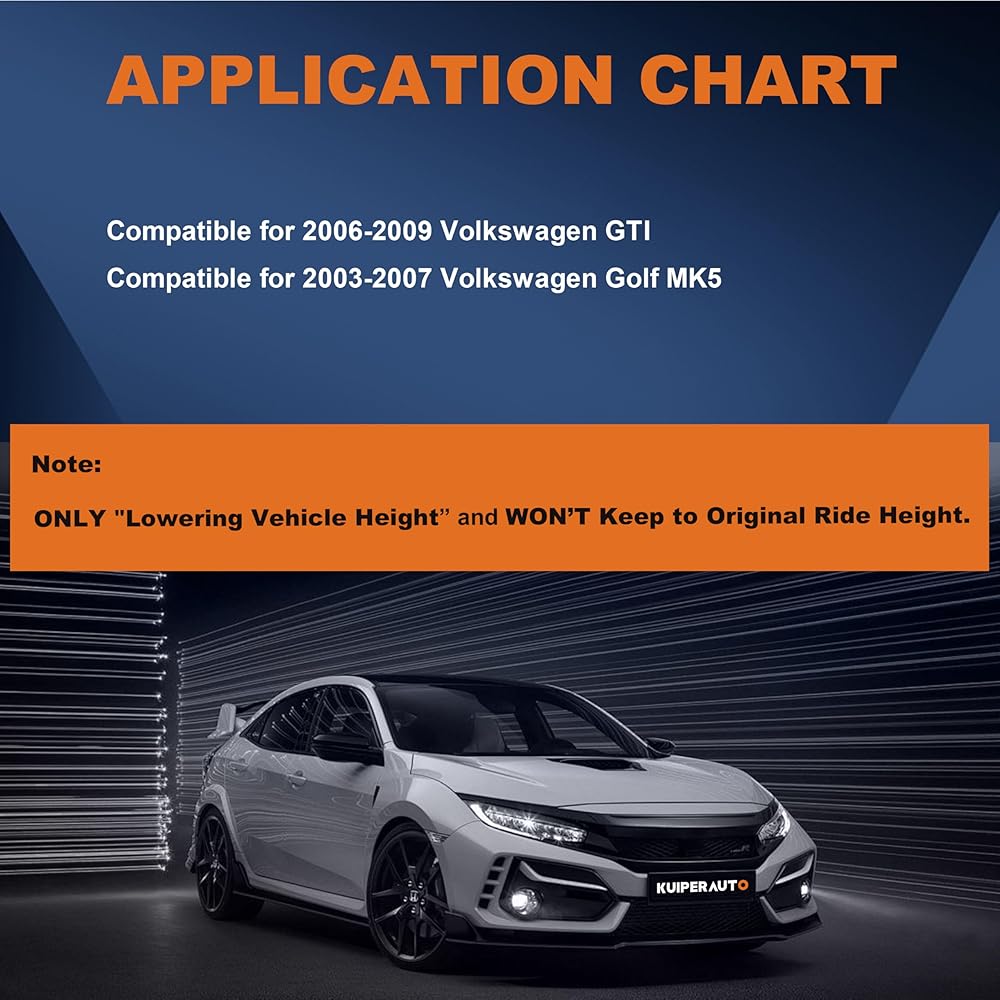 [ Application & Lowering Height ] — Compatible for 2003-2007 Volkswagen Golf MK5; Compatible for 2006-2009 GTI —— These Coilovers Strut will Lowering the vehicle height around 1“ to 3“ and WON'T keep to Original Ride Height.