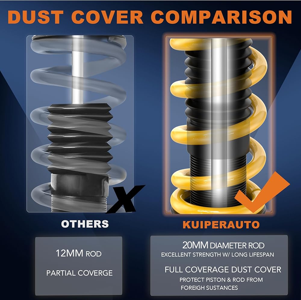 [ Spring Rate] — Front Spring: 8 kg/mm (448 lbs/in) ; Rear Spring: 6 kg/mm (336 lbs/in);Non-Adjustable Damper; 20MM Rod with full dust cover can protect the damper and extended service life.