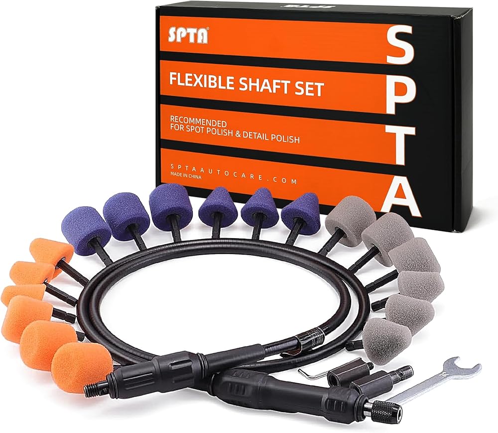 3 DIFFERENT HARDNESS: The polishing cones and drums come in three levels of aggressiveness: Orange Foam - A hard foam for removal of heavy imperfections.Blue Foam - A medium foam for moderate imperfection removal.Gray Foam - A fine foam for finishing and polishing to a high gloss.Use Flexible Shaft Set to polish the corners of your car, such as behind door handles, between wheel spokes, between grille slats, inside hood vents. It easy to polish tight areas, car wheels, headlights, door handles and more.