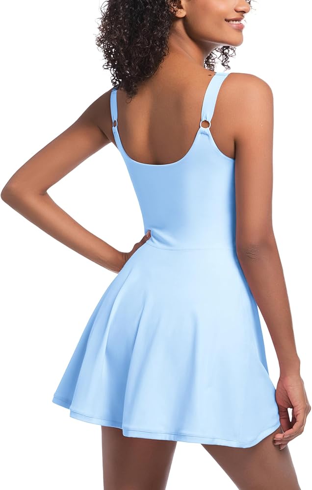 Feature:This feminine sport dress is designed to keep you feeling supported during all your favorite activities. Fashion-forward and beyond functional, a squareneckline, sleeveless, adjustable shoulder straps with low scoop back, shelf bra with removable padding, seams at waist for shaping, side slit, flare and a mini-length A-line dress.