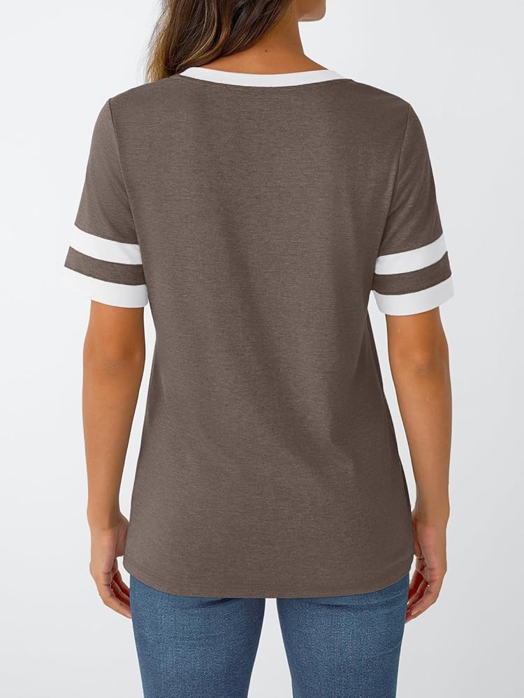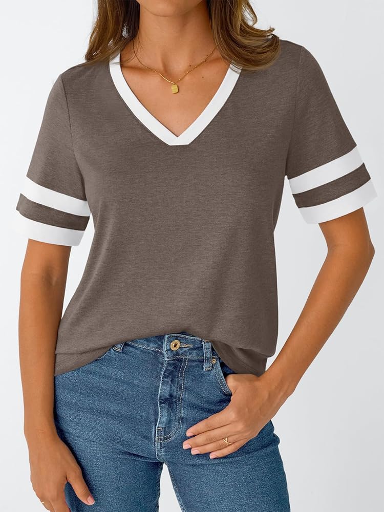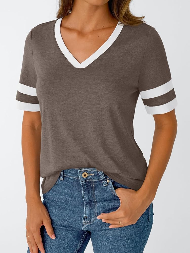 Design: Basic t-shirts, v neck, colorblock striped on the short Sleeve, loose fit, lightweight, casual style, suitable for spring, summer and fall.