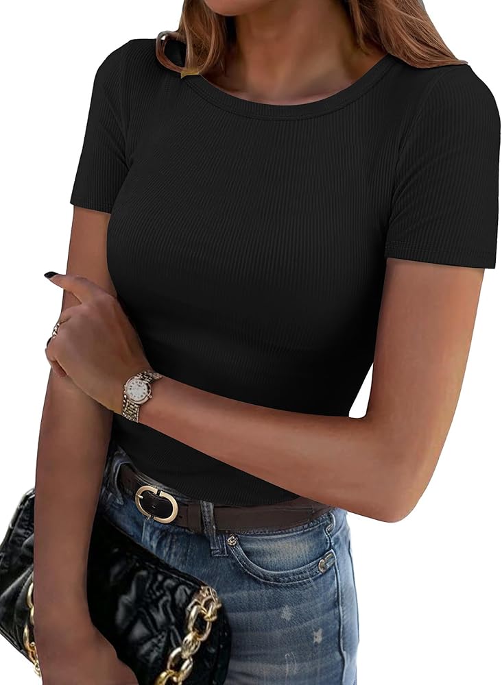 Match:Womens Short Sleeve Tops/Crew Neck Tee Shirts/Ribbed Tops/ Summer Tshirts. This ribbed short sleeve shirt is basic and simple and can match any summer fashion item. Its perfectly with shorts, jeans, skirts, yoga pants, or cargo pants for a fashion look