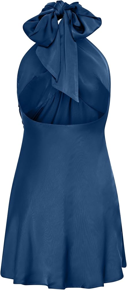 [Halter dress] - This satin mini dress for women features tie halter neck, wrap front, crisscross design, side zipper, open back, sleeveless, backless, a-line shape, short formal dress, cocktail dress, summer satin dress