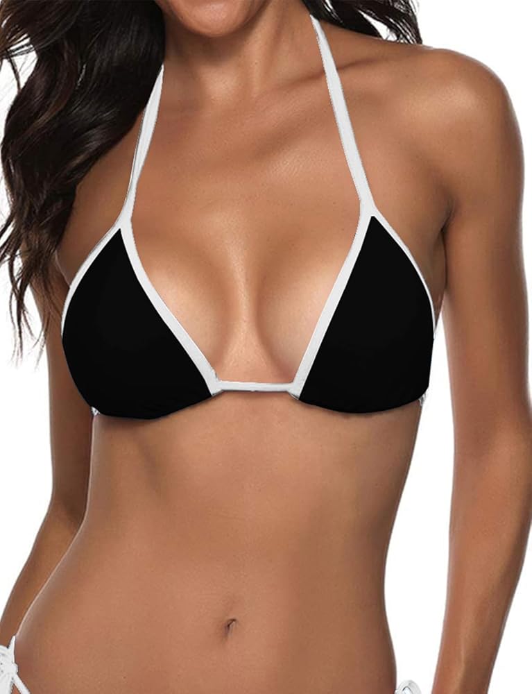 Fashion halter triangle bikini top feature adjustable tie at neck and back,the removable padded up bras, offers great support and enhance your shape, brings you closer fitting, ultra chic and adorable.
