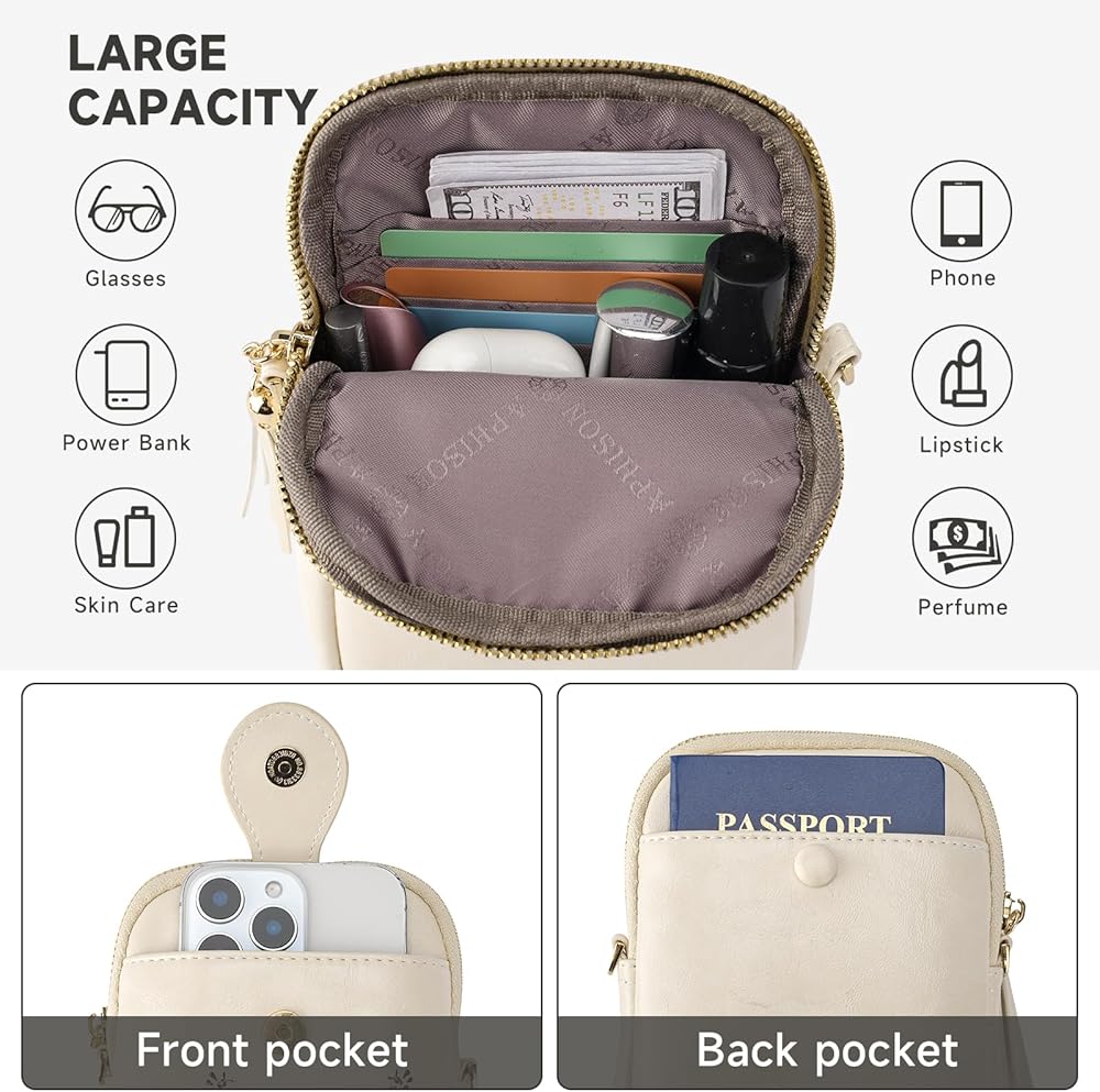 Exterior for small but roomy purse- 1 Front Phone Pockets with magnetic closure( fits up to 6.7" phone, like Phone 13 Pro Max, 13 Pro, 13, 8plus, X, XR, Xs max etc.) and 1 zippered Back Pocket for cards or coins; Interior - 1 Main Compartment: Some daily little thing, such as your mobile phone, wallet, card case, cosmetics, changes, credit cards, ID, folded bills, keys, lipsticks, receipts, or some small stuff, etc can be well organized.