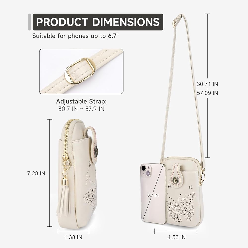 Crossbody bags for women made of high quality premium synthetic leather, lightweight, durable, waterproof and soft. Ladies purses' size: L 4.53IN* W 1.38IN* H 7.28IN. Weight: 0.35lb. Equipped with adjustable shoulder strap ( 30.71" - 57.09"), the practical crossbody shoulder phone purse, suitable for shopping, dating, work, hang out, travel, etc. Can replace your bulky bucket bag and relax your shoulders.