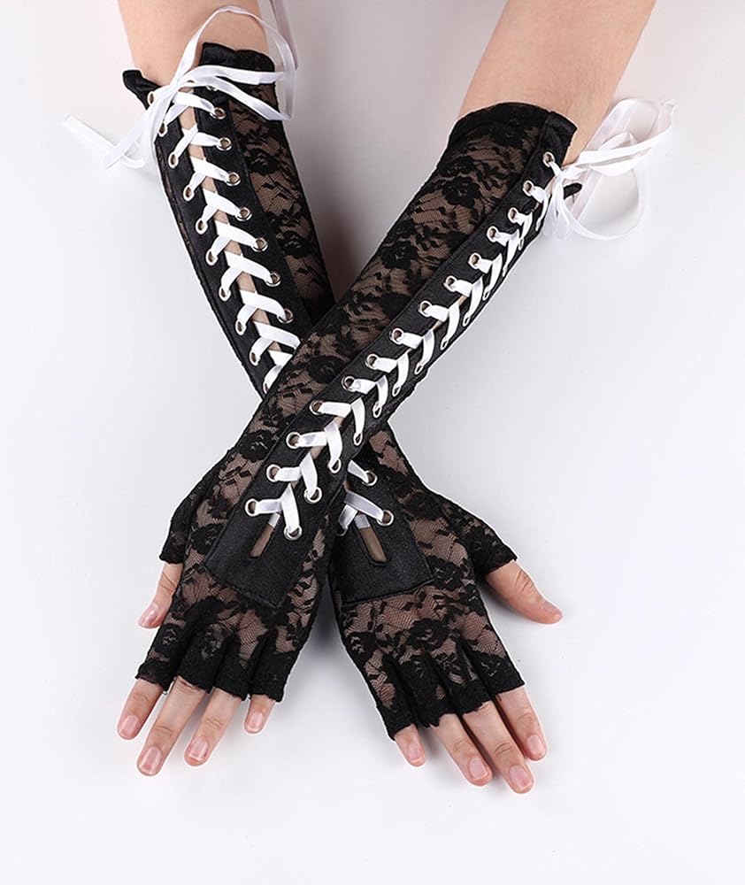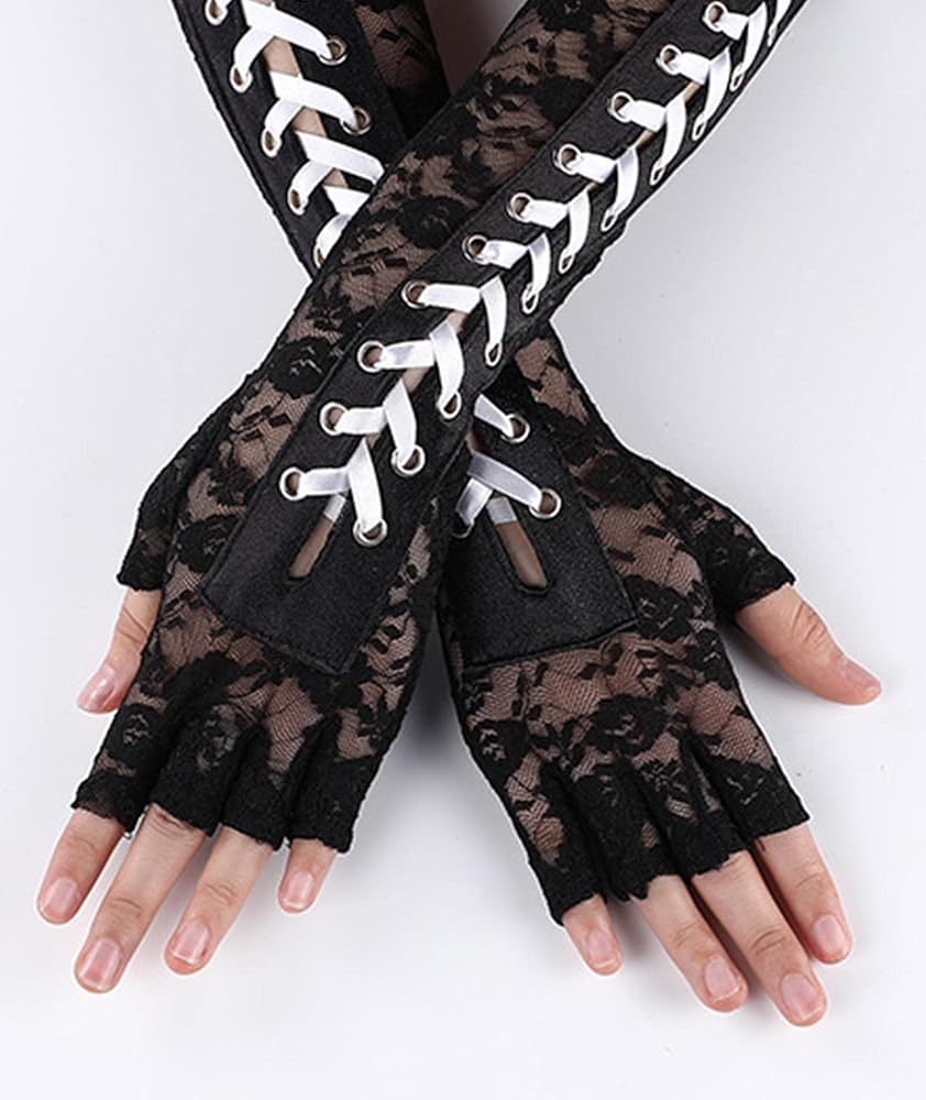 Material Type: The lace up gloves measures approximately 14.56". Adjustable satin lace up design, plenty of stretch to ensure a comfortable fit, high quality lace fabric. Which is soft, comfortable to touch, durable and lightweight to wear.