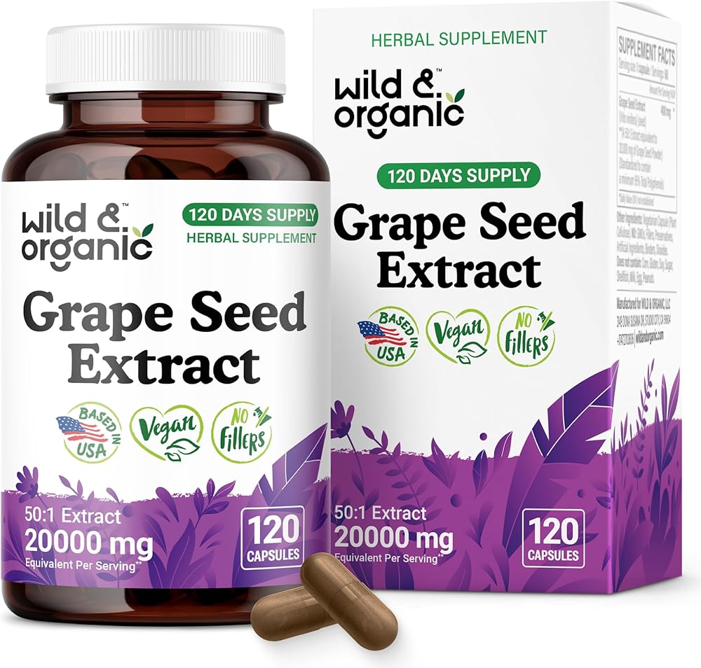 Antioxidant Support: Each serving of Wild & Organic grapeseed extract capsules contains 400 mg of grape seed extract (equivalent to 20,000 mg of grape seed powder) for antioxidant support.
