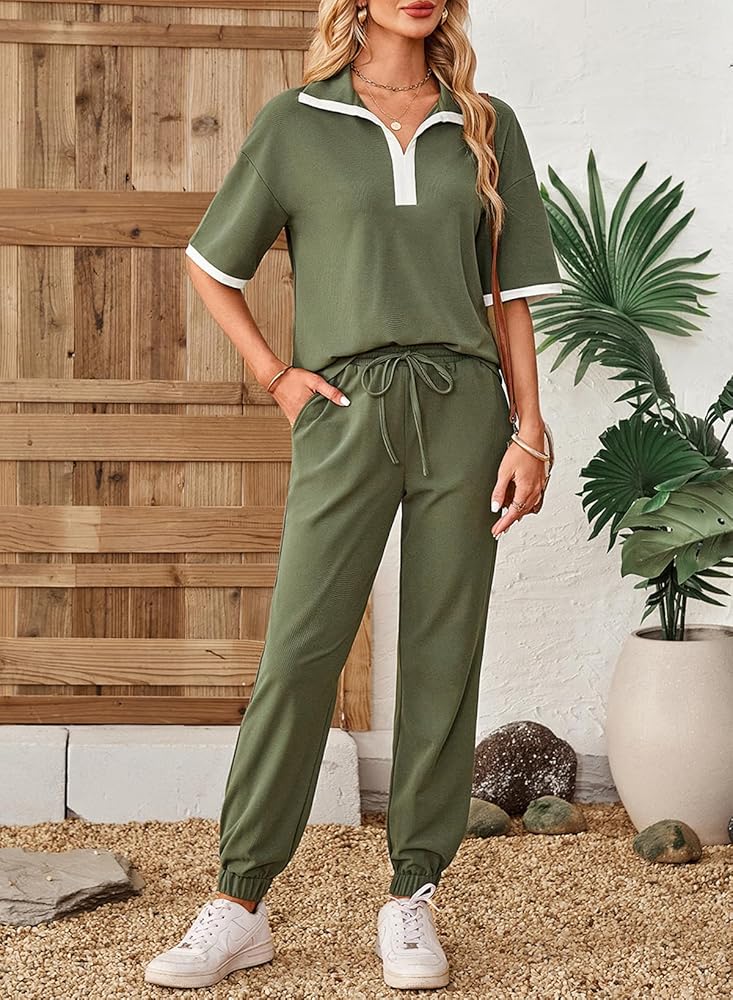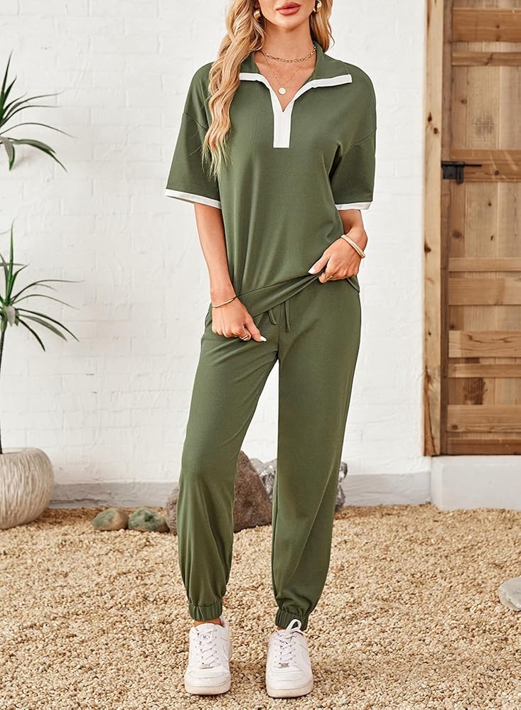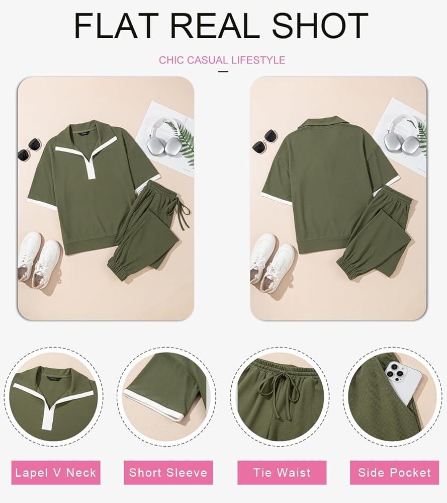 Unique Design:The Womens Sweatshirt Features Short Sleeve, Lapel V-Neck. The Sweatpants Combined a Elastic Waistband With Side Pockets, Creating a Trendy And Active Silhouette.