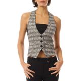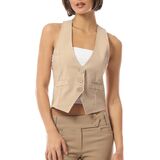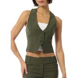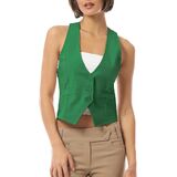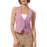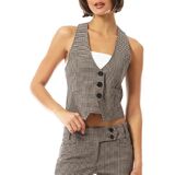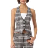 Features: V-Neck, Solid or plaid pattern, sleeveless, racerback, three functional buttons in the front, faux welt pockets, pointed hem, unlined, adjustable strap in the back offering more accurate fit.