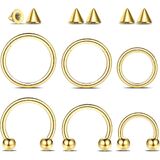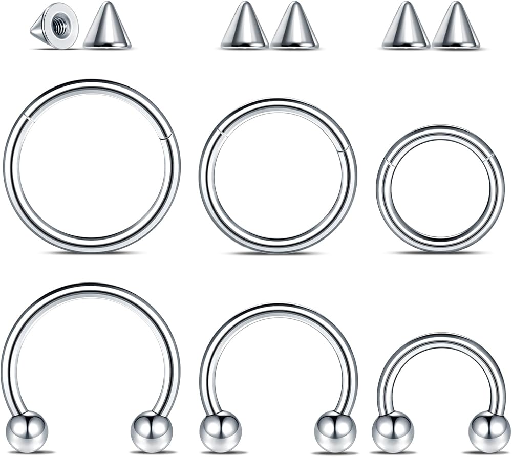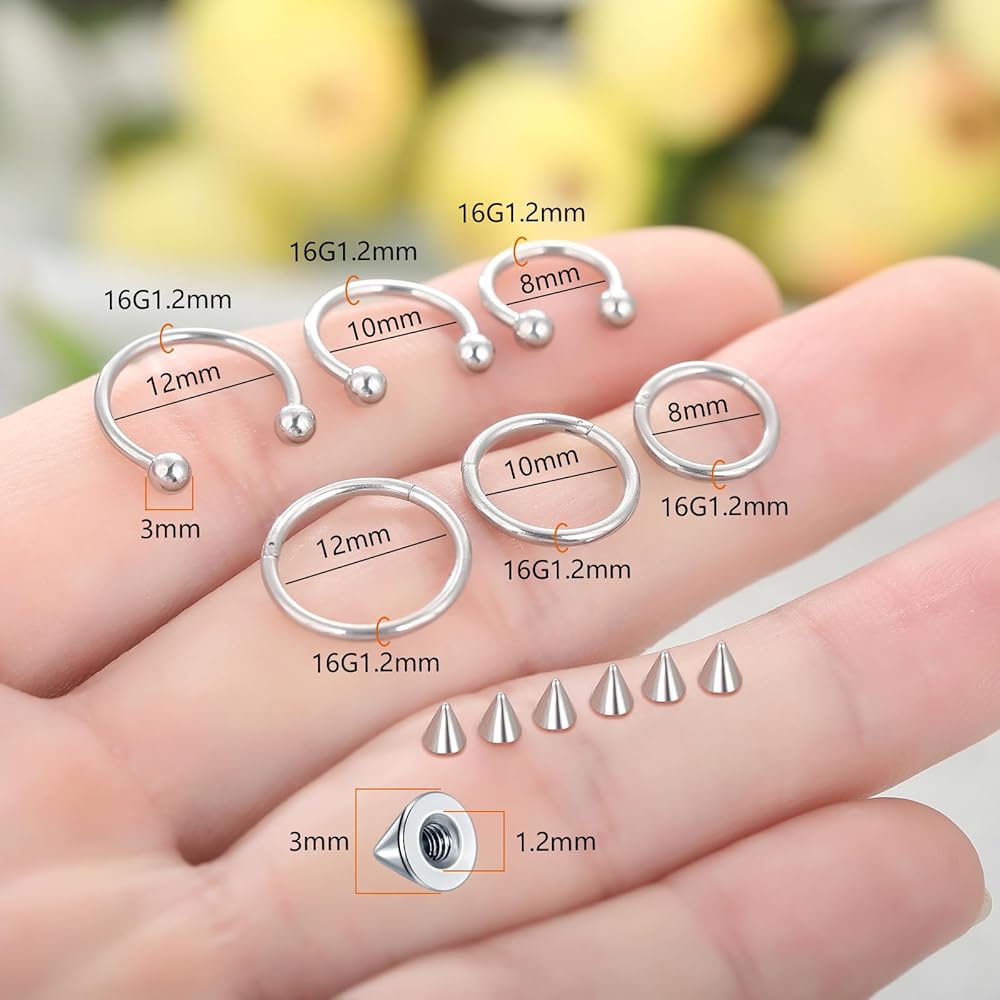 - 6PCS Nose Rings Set: 3PCS Nose Rings Hoops + 3PCS Horseshoe Septum Rings with 6pcs replacement spikes.