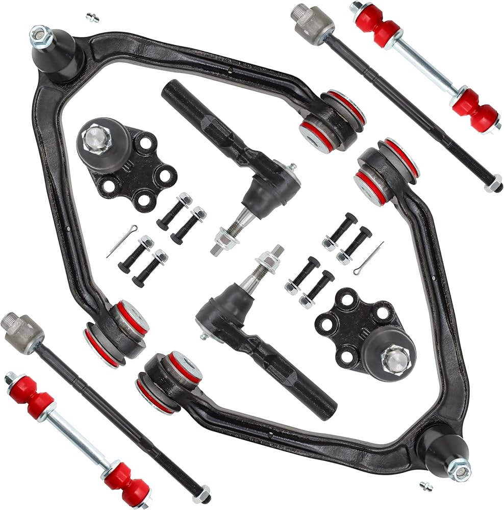 Comprehensive Front Suspension Kit: 2x Front Upper Control Arms w/ Ball Joints Assembly - K80942PU, 2x Front Lower Ball Joints- K6539, 2x Front Sway Bar End Links- K80631PU, 2x Front Inner Tie Rod Ends- EV370, 2x Front Outer Tie Rod End- ES3492, 2x Rack & Pinion Tie Rod Boots- BT-26078815