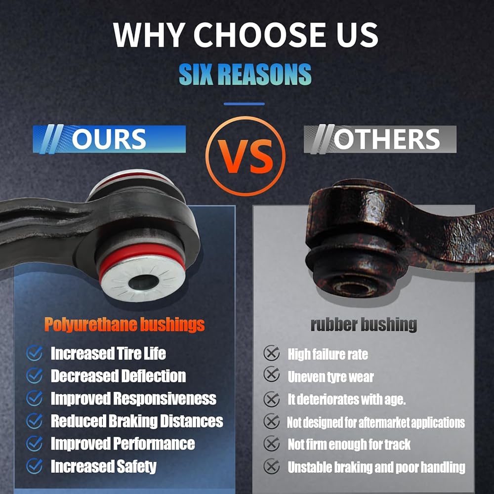 Easy Installation: Built to OEM specs for a hassle-free install. No modifications needed. Precision-engineered bushings and ball joints ensure a tight fit and proper alignment.