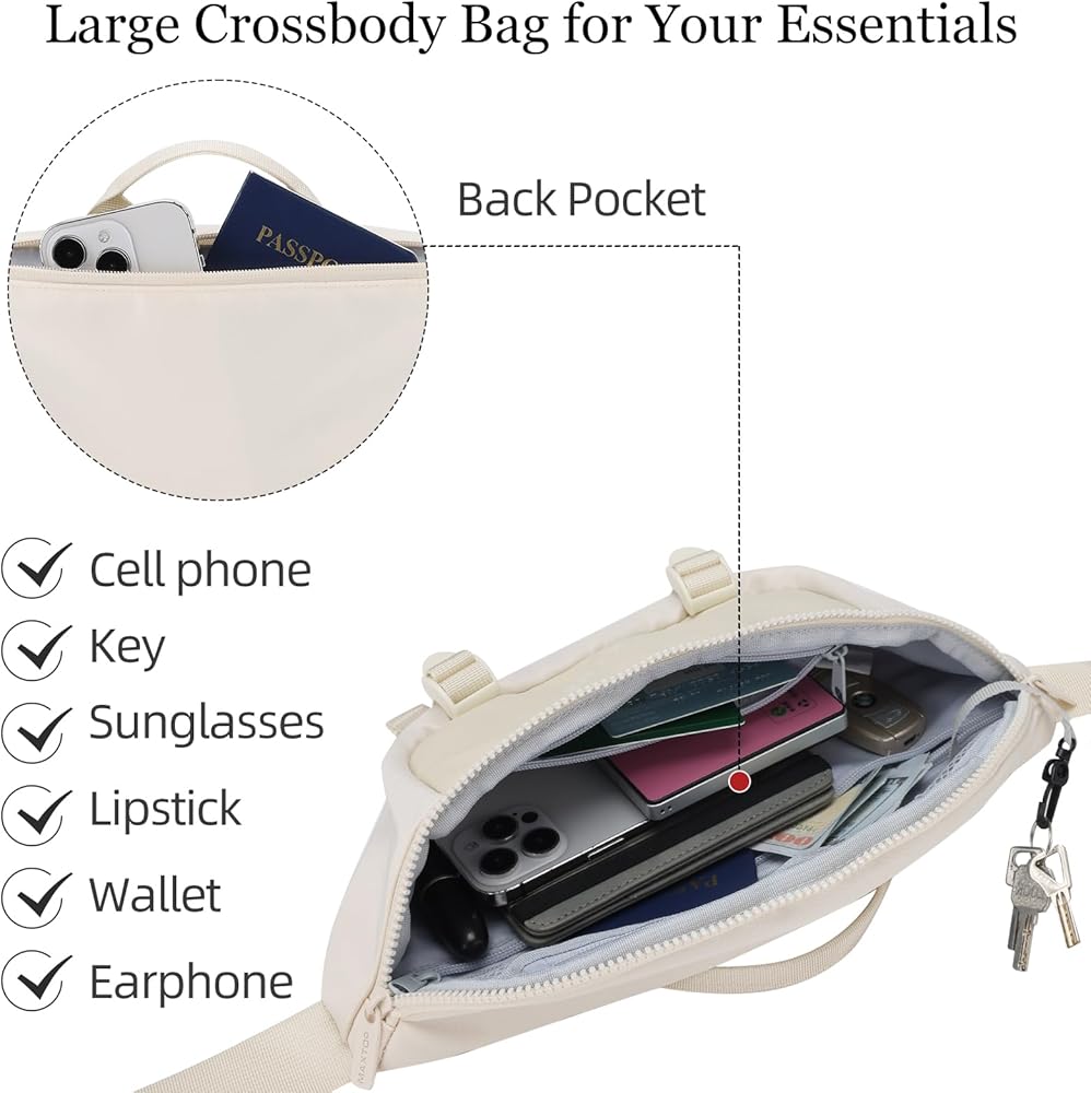 【Roomy Capacity & Multiple Pockets】:The fanny pack size is about 13.39"x 3.15" x 5.51" with 5 zippered pockets.There are 2 zippered mesh pockets and 1 zippered pocket inside the main zippered pocket perfect for organizing your essentials separately such as all size phones,passports,keys,power banks,ID cards and other travel essentials.Zipper mesh bag can store small items such as Bluetooth earphones, lipstick,etc.