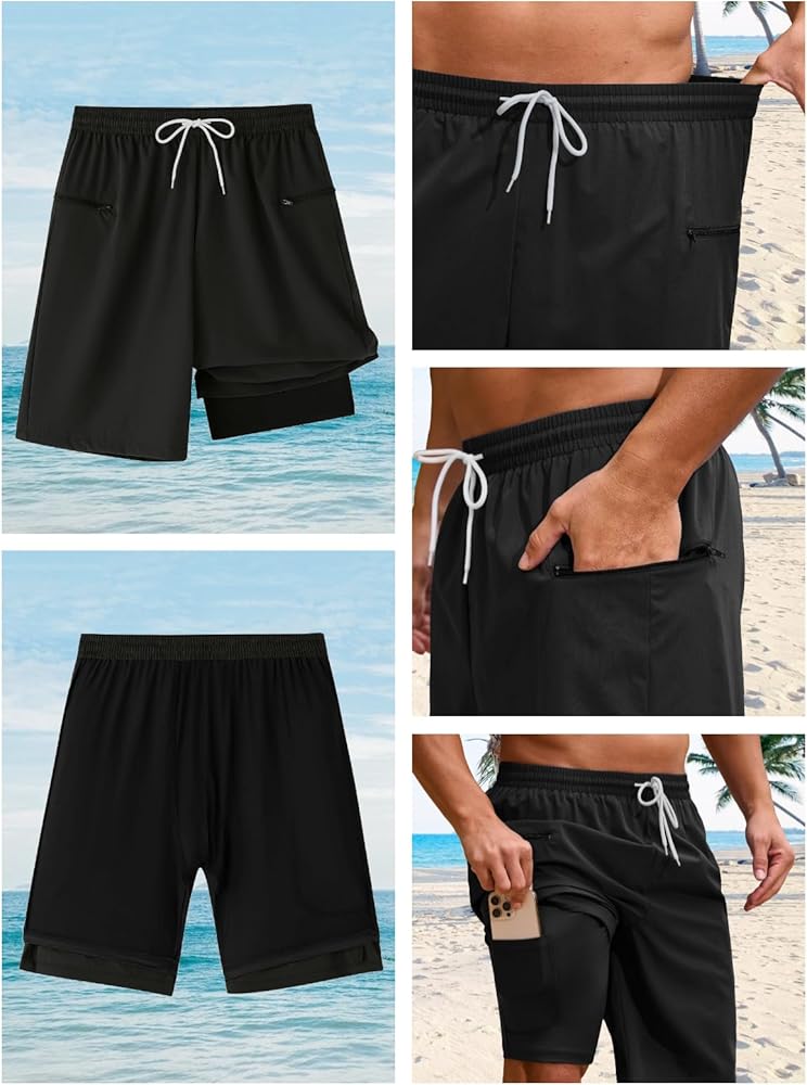 2 in 1 Shorts Men Swimsuit: Mens swim trunks with compression liner provide extra support and comfort, keeping you dry, comfortable and preventing from sticking to your skin even during intense physical activities or in humid conditions, mens bathing suit 9 inch inseam perfect for swimming, surfing, kayaking, drifting, fishing or casual summer wear