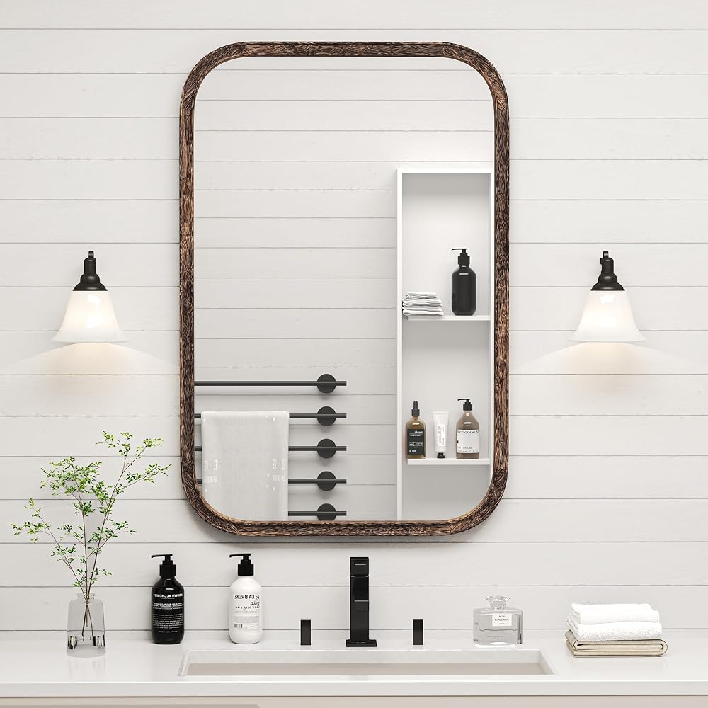 24"x36" Solid Wood Framed Mirror Bathroom Mirror Tempered Glass for Wall Mounted, Rustic Wood Frame Wall Mirror Decorative for Living Room Bedroom Vanity Entryway, Rustic Brown