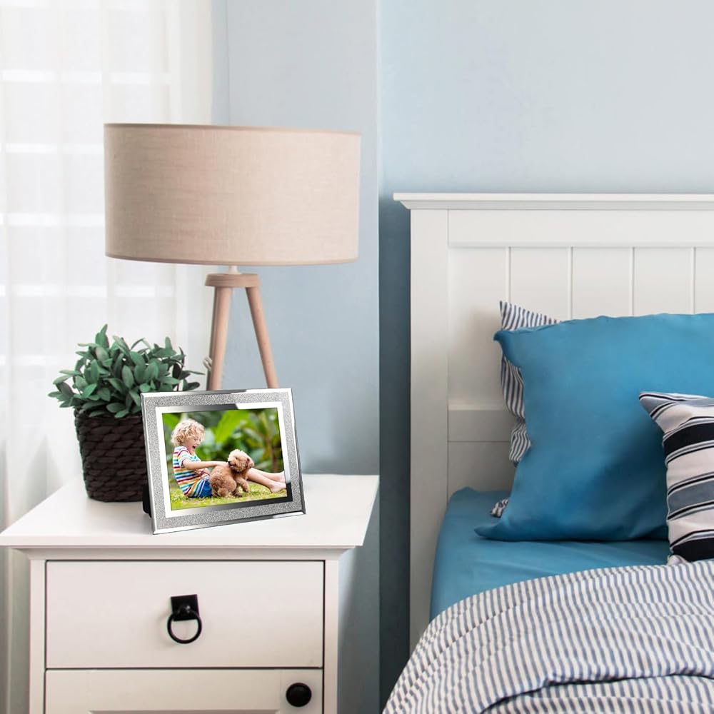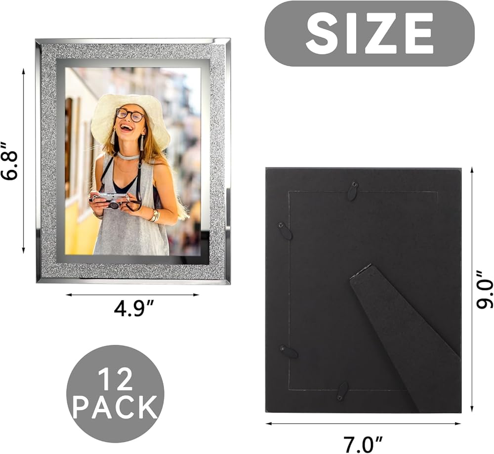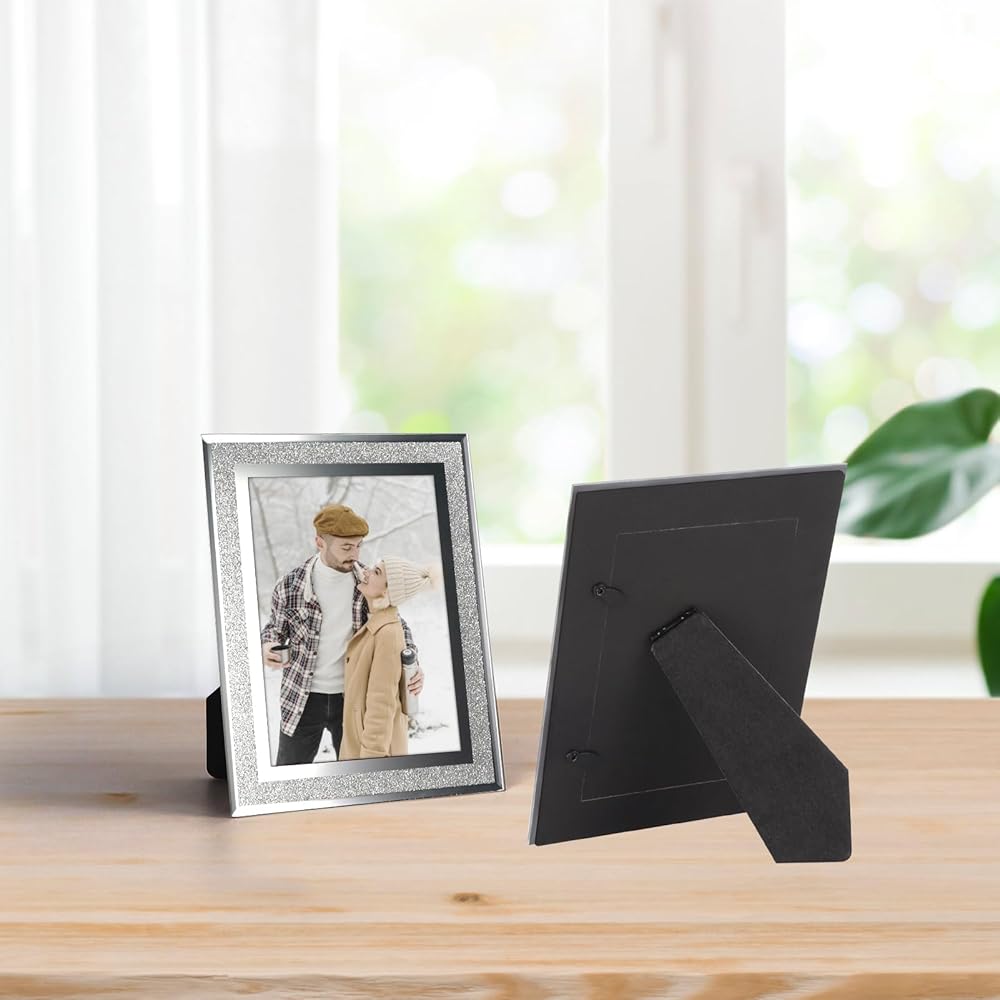 ATTRACTIVE SPARKLE DESIGN. Stylish glass picture frames accented with beveled cut and glitter decoration, it will draw eyes to the photo and makes an effective display.