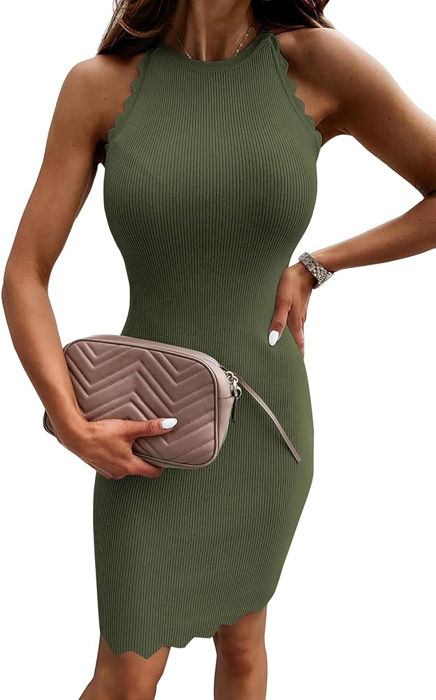 miduo Womens Scallop Trim Halter Neck Sleeveless Sweater Ribbed Knit Mini Dress Bodycon Club Party Dresses
