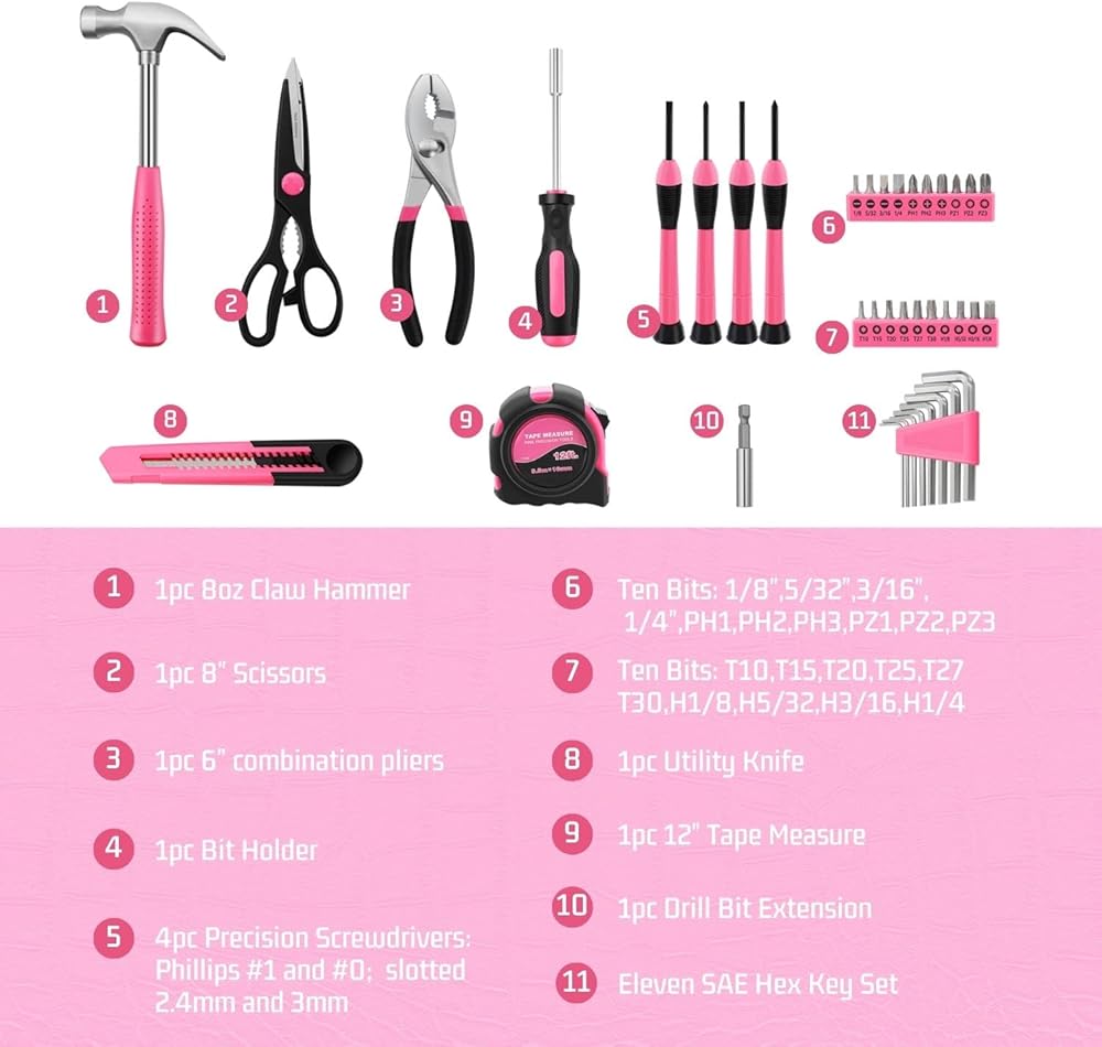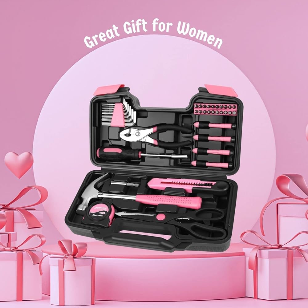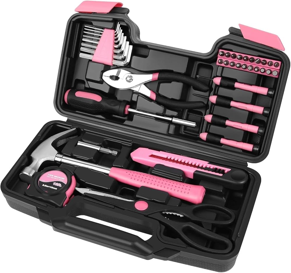1x 39 Piece Hand Tool Kits with Case - Compact Tool Kit for Handyman, Homeowners DIY - Household Tool Kit for Home with Portable Basic Tool Set Case, Pink