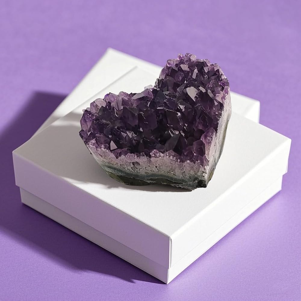 Luxury Gift-Ready Packaging with Storage Bag Each amethyst crystal cluster heart arrives a white gift box decorated with green paper grasses. Included is a reusable purple burlap pouch to protect your crystal during travel or storage. Perfect for birthdays, spiritual milestones, or self care surprises, Ideal for crystal enthusiasts who value both style and sustainability.