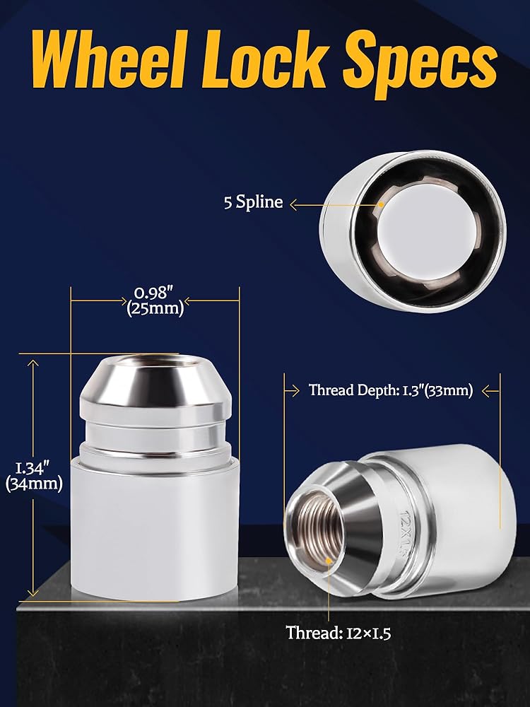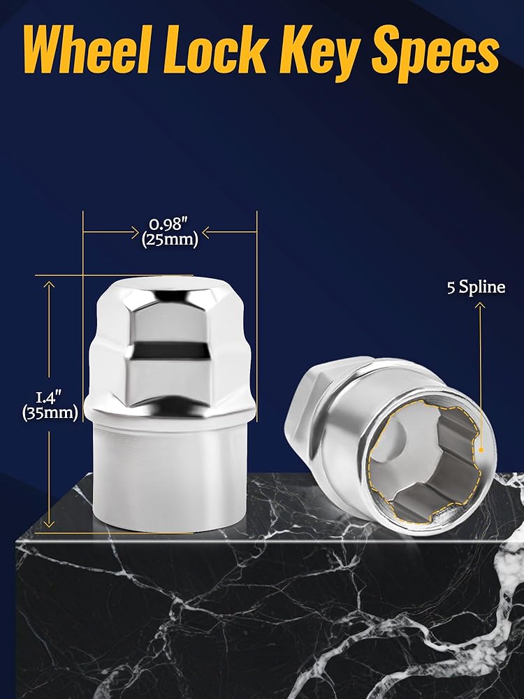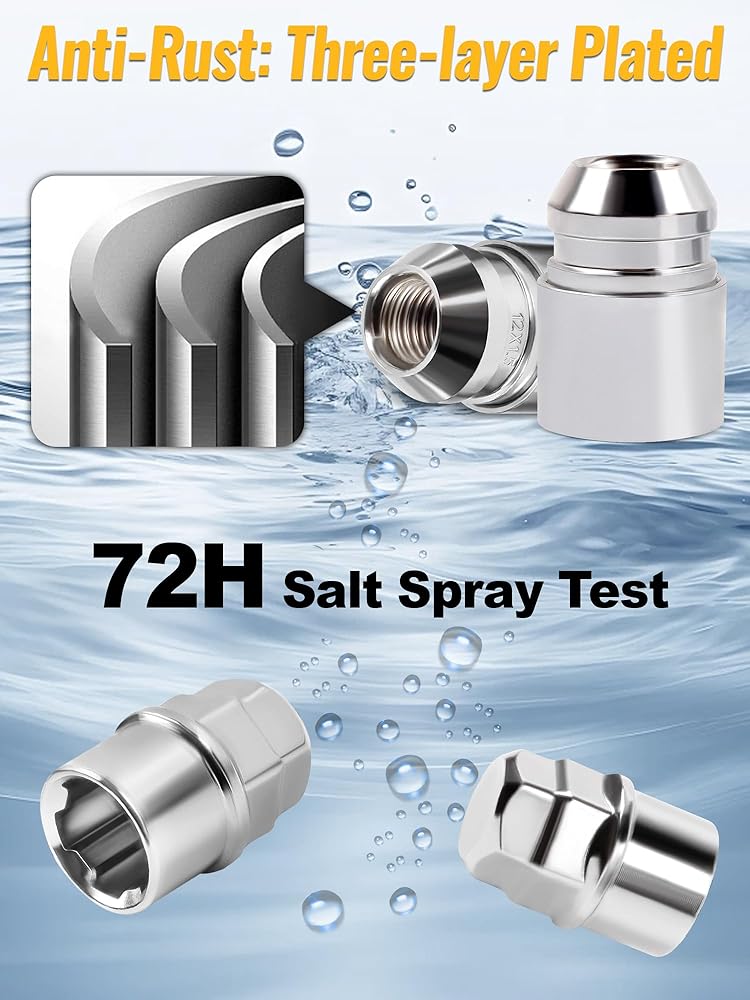 【Material】Tug nut lock is made of heat - treated 10.9 carbon steel material, which provides high strength and durability, tested by a 72 - hour salt spray test. The chrome - plated surface of lug nut lock is rust - proof, making the car wheel lock stylish and beautiful
