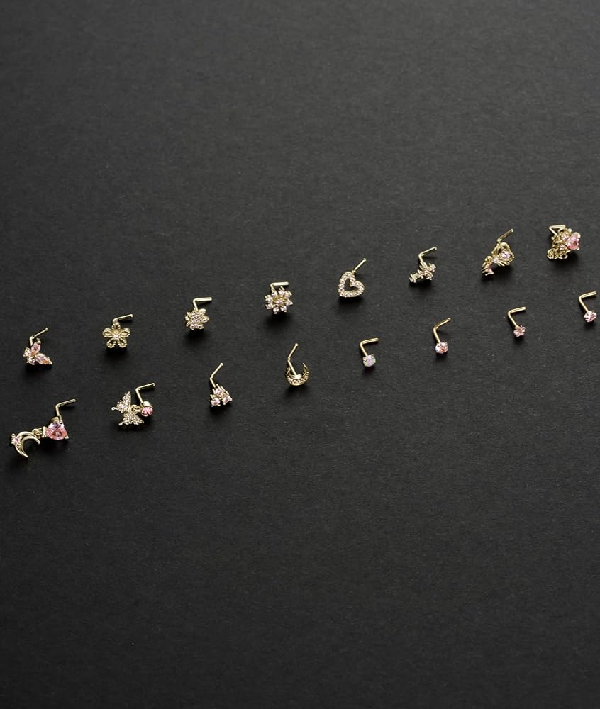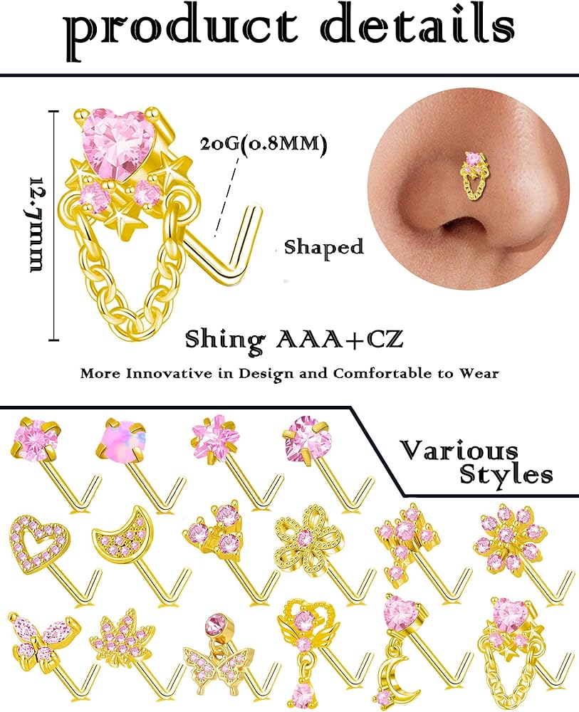 Akeoqi 16Pcs Nose Rings L Shaped Nose Studs Stainless Steel Pink CZ Opal Butterfly Flower Leaf Heart Moon Star Dangle Body Piercing Jewelry for Women Men 20G Gold Silver Tone