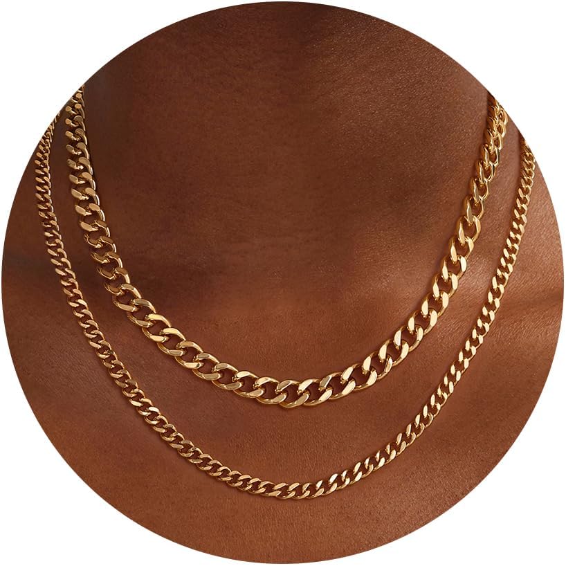 • Layered Necklace Set Size: 2 Layers gold necklaces women:8MM 16.5"+2" cuban link chain and 5MM 18''+2" cuban link chain for women. Simple and stylish chunky gold necklace can be worn alone or layered