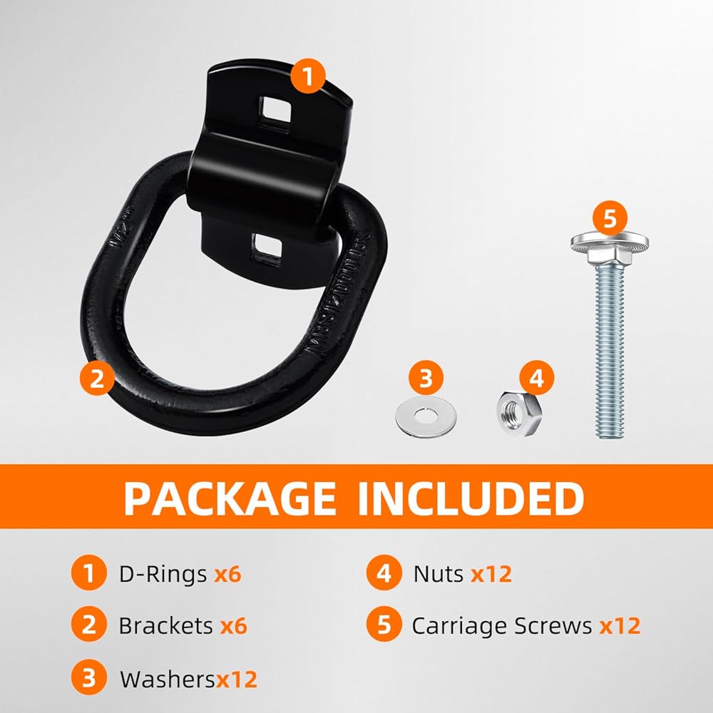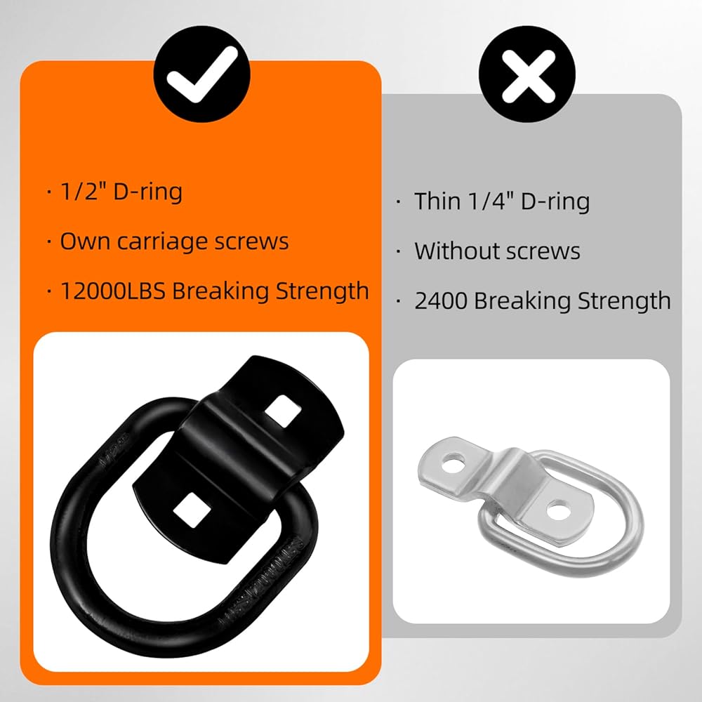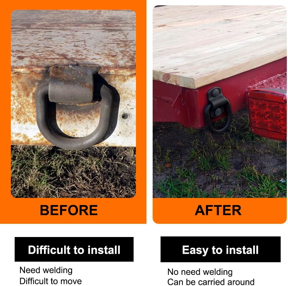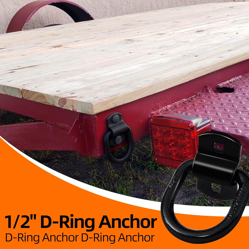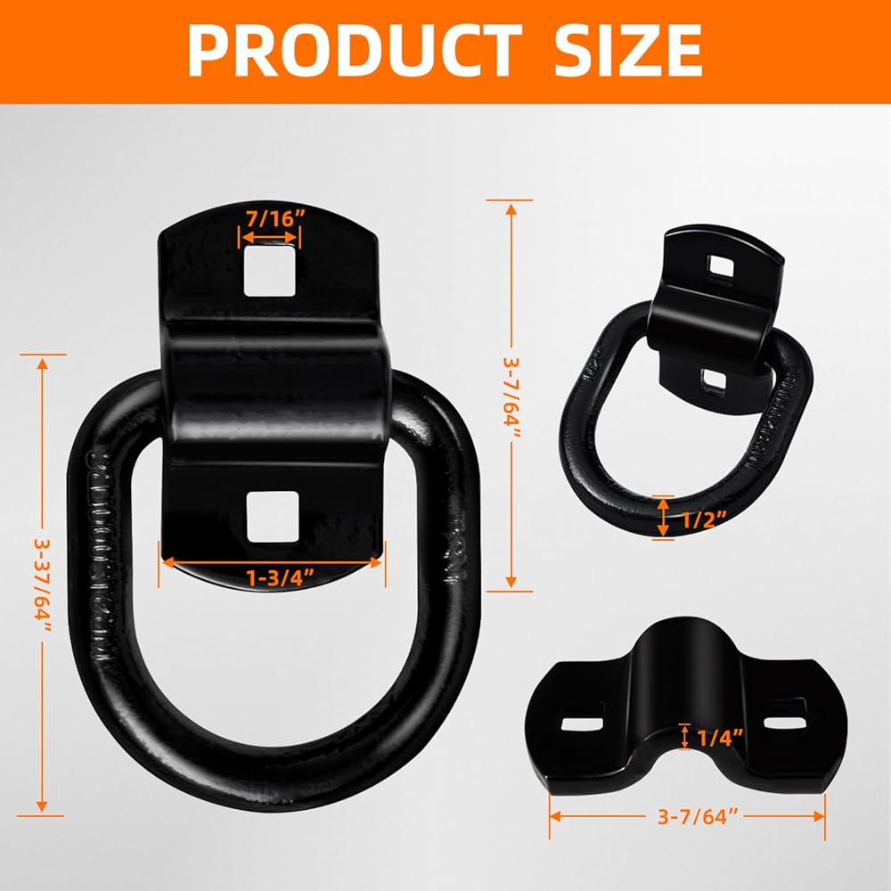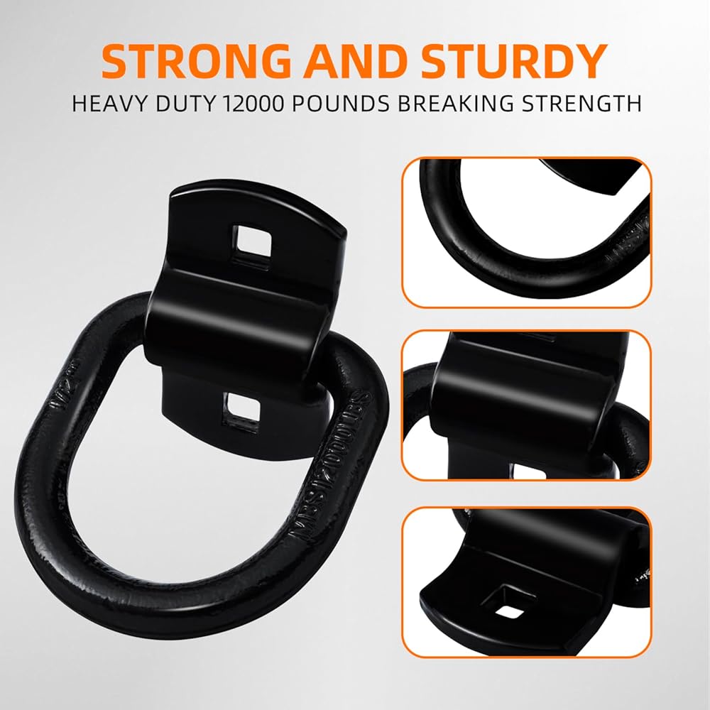【Heavy duty construction】Trailer d ring anchors are made of heavy duty steel with high-quality screws.3/8" D-ring accepts most tie down hooks.Use this can tie down your cargo easily.Max break strength is 6000lbs.
