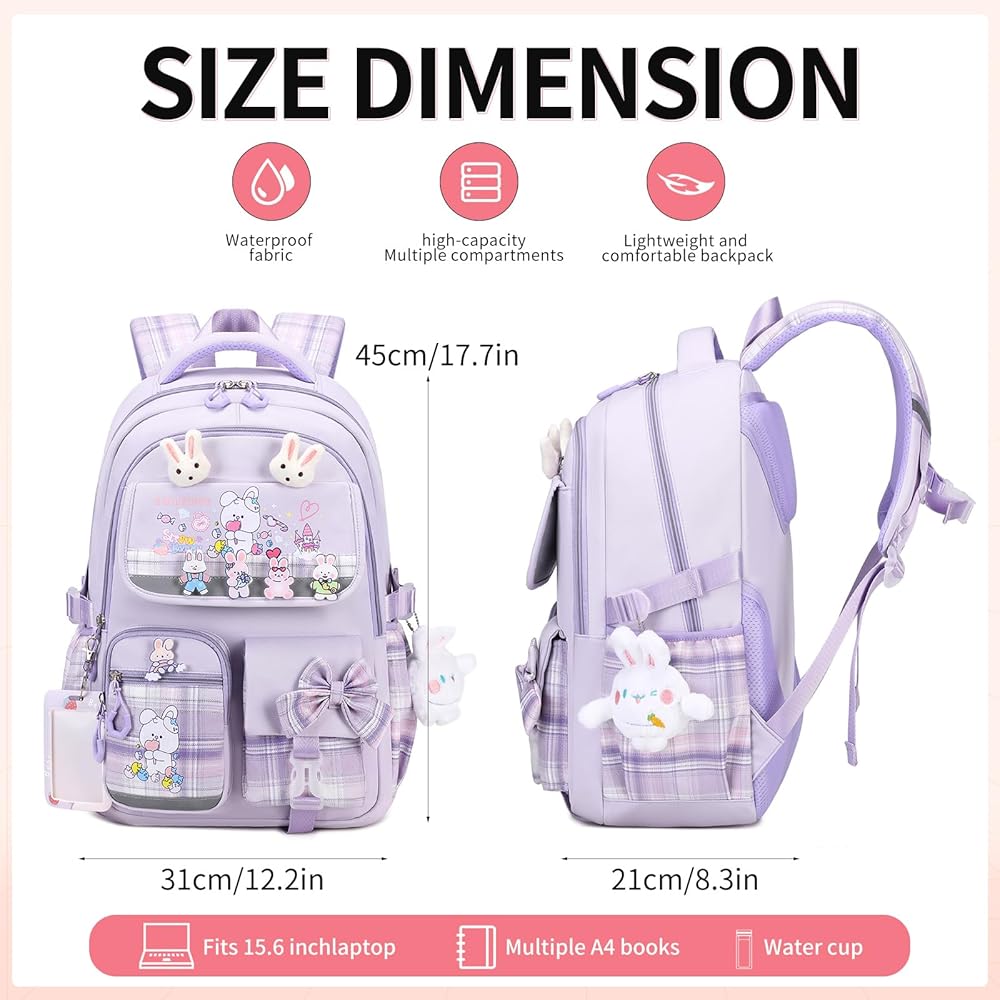THE GIRLS BOOKBAG MEASUREMENT: 12.20" x8.3" x 17.7" (L*W*H) inches, weighs 1.4LB., one separate laptop compartment holds a 15.6" laptop, main compartment holds books, binders and lunches box. The backpack is designed with multiple storage pockets on the front and sides, which can be used to store wallets, keys,Text Books,Lunch Box School,Umbrella, Basic Essentials all Can Be Fited, allowing you to better organize all your small things.