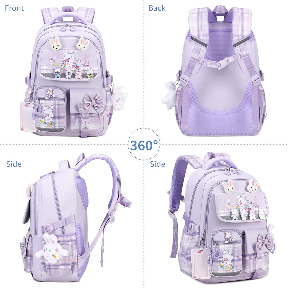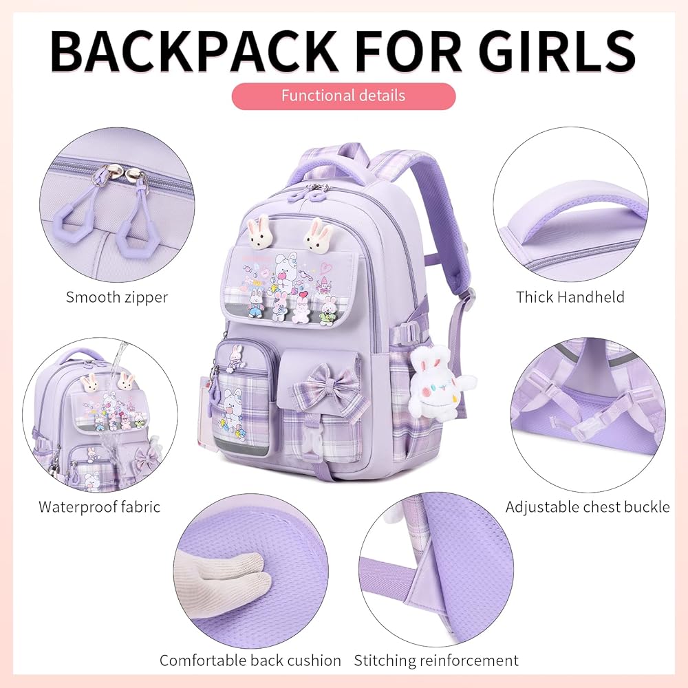 BACKPACK FOR GIRLS: This school backpack for girls is made of water resistant and durable nylon fabric with Adopted with a Thickened Sponge of the Padded Shoulder Strap and Back Panel relaxing the stress of their shoulder.The bookbag is equipped with 7 badges + 1card sleeve + 1 Pendant. The school bag is a good gift for elementary school, middle school, high school and college students.