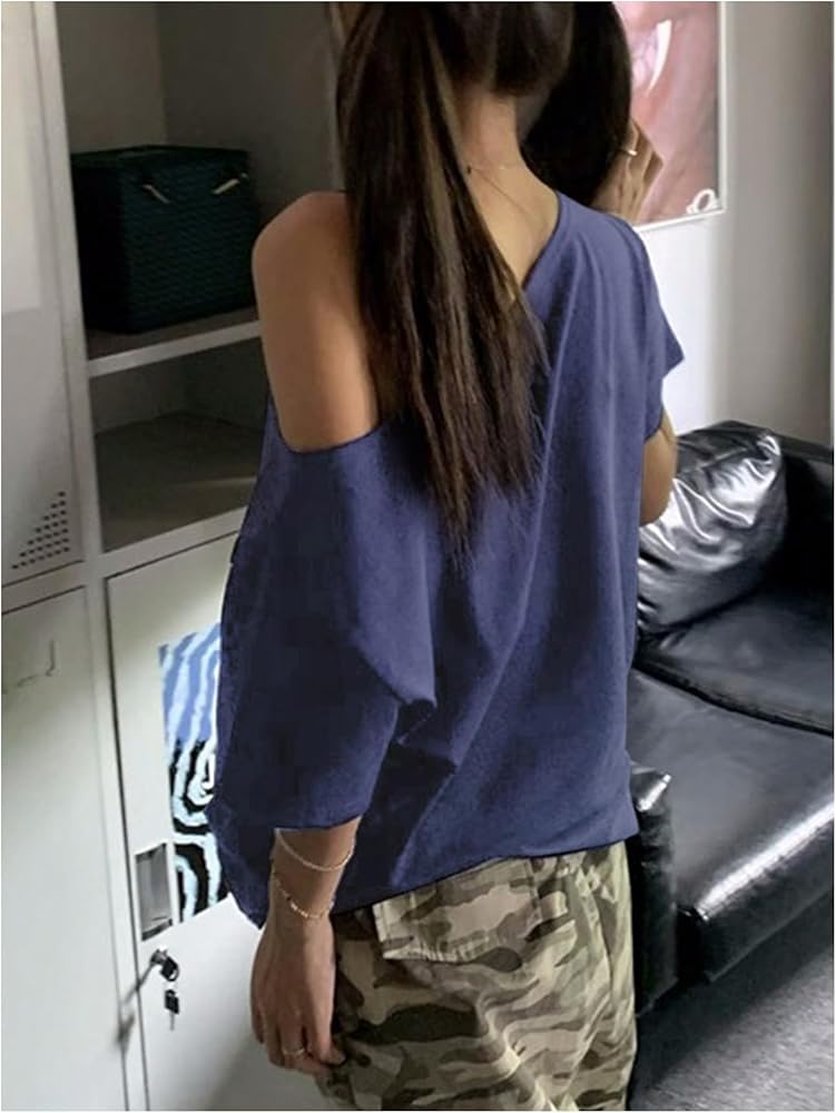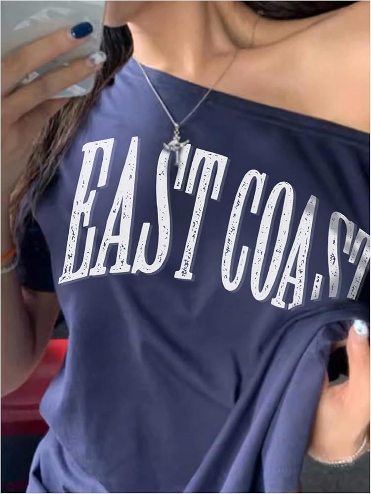 Feasures: Womens oversized tshirts design off shoulder, letter print, short sleeve, y2k, vintage, soft, trendy, lightweight