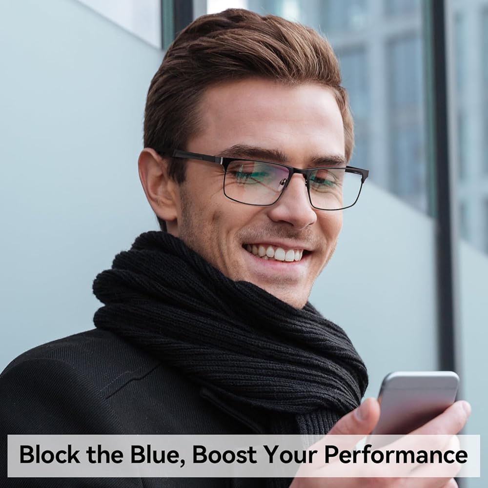 EFFECTIVE ANTI-BLUE LIGHT-Blue light exposure from computer/mobile screens can cause eye strain, fatigue, and disrupted sleep patterns. Our blue light blocking glasses use lenses that have been specially coated to filter blue light, effectively filtering out harmful blue light, allowing you to focus on what matters most without discomfort. Get clearer vision, less eye strain, and a more comfortable viewing experience every time you wear them.
