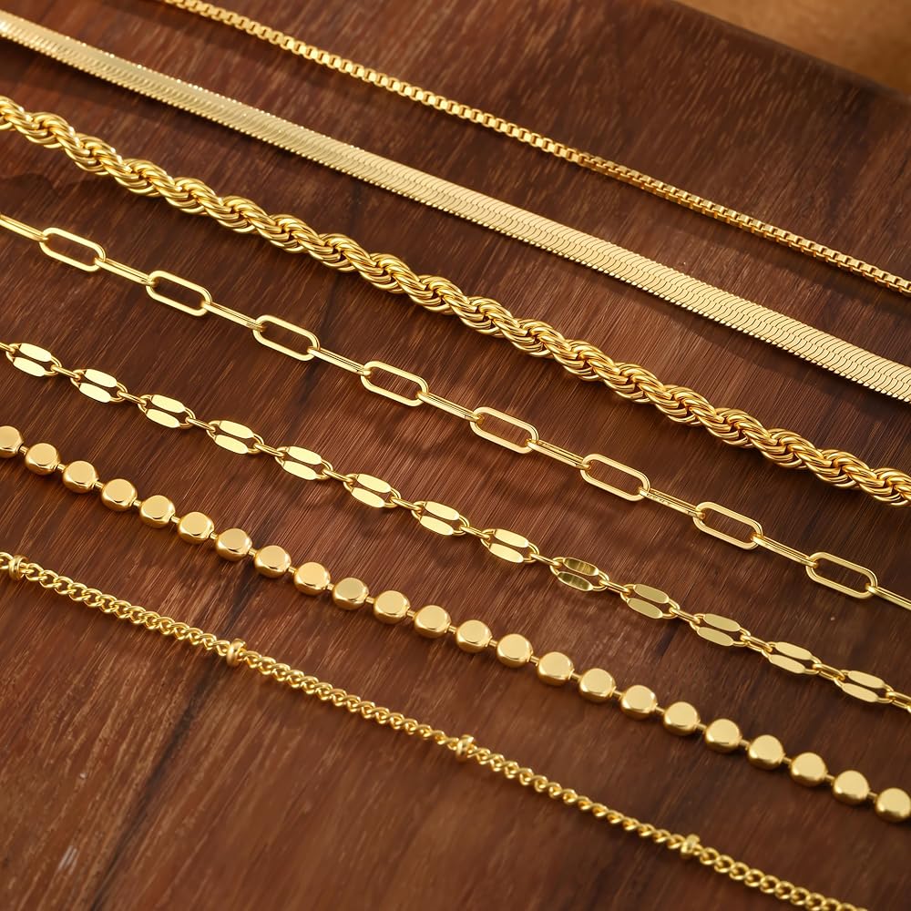 Gold Bracelets Set for Women, 14K Real Gold Plated/Silver Dainty Link Chain Bracelets Ring Hand Chain Charm Stackable Cuban Link Paperclip Bracelet Non Tarnish Jewelry Accessories Gifts
